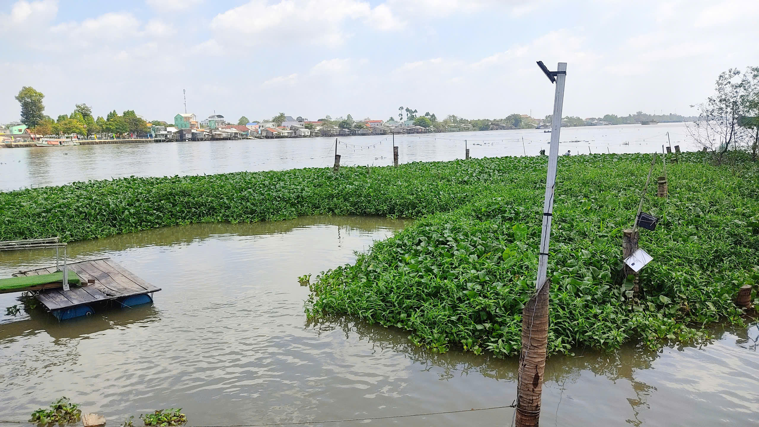 Ông Vẹn còn cắm cọc xung quanh, lắp đèn điện trước bến sông nhà nhằm để bảo vệ đàn cá. |