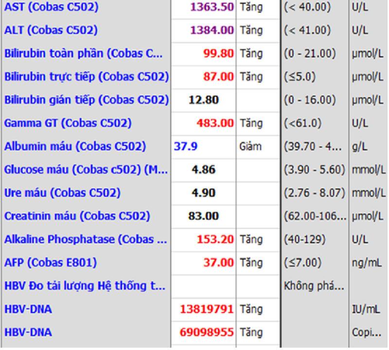 Đúng như tiên lượng của bác sĩ, chỉ số xét nghiệm men gan (AST, ALT) tăng 34 lần, Albumin: giảm, AFP: tăng, đặc biệt xét nghiệm HBV DNA - xét nghiệm xác định số lượng hay nồng độ của virus trong máu của người bệnh nhiễm virus viêm gan B cho kết quả 10^7 IU/ml. Siêu âm ổ bụng có hình ảnh gan thô nhẹ. Từ kết quả này, bệnh nhân được chẩn đoán đợt bùng phát viêm gan B mạn nên được tư vấn nhập viện điều trị nội trú nhằm tránh bệnh tiến triển nặng.