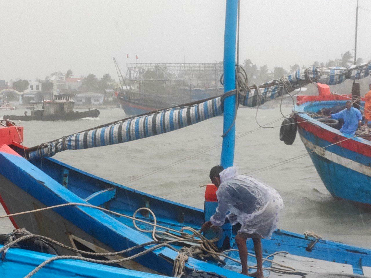Người dân Quảng Nam đội mưa neo đậu tàu thuyền trước khi bão đổ bộ. |