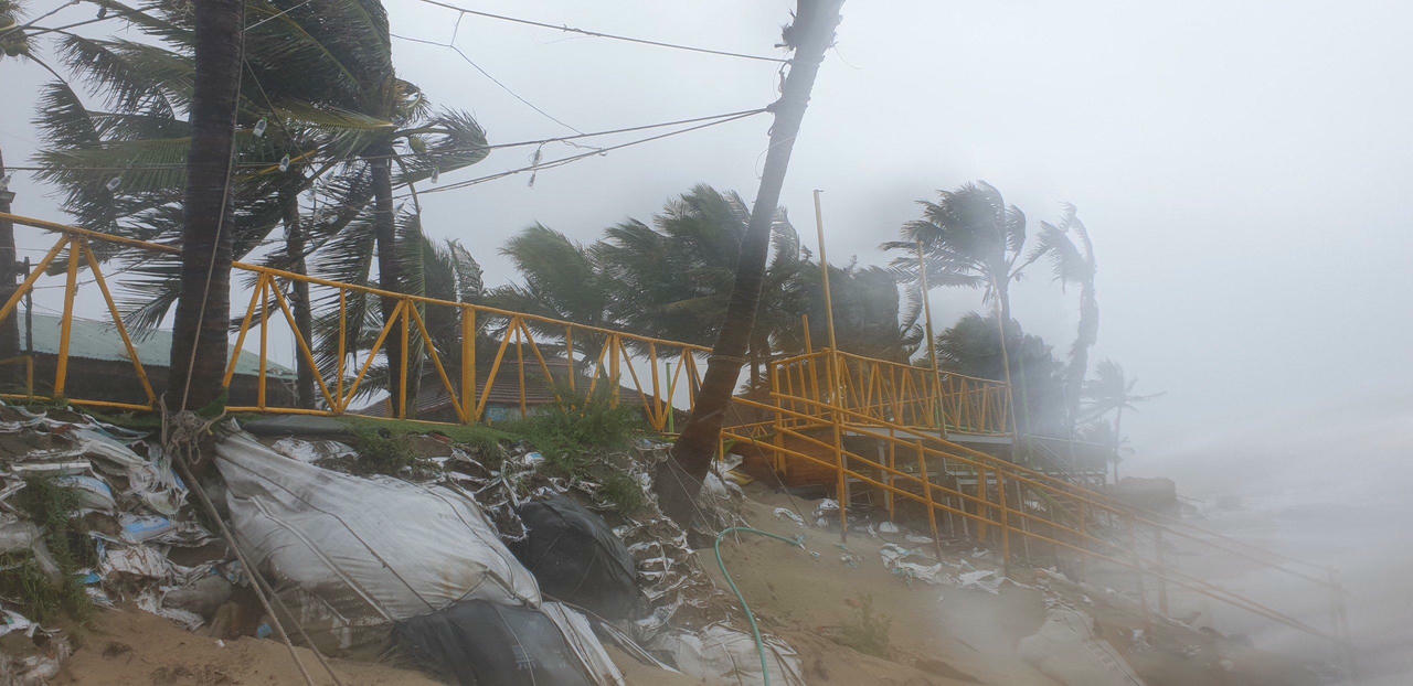 Những cột sóng cao do mưa gió lớn đánh vào bờ và các hàng quán ven biển. |