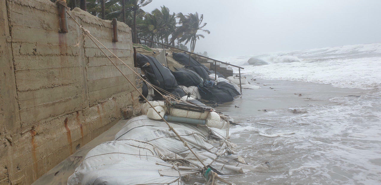 Những bao cát khổng lồ bị sóng đánh rách được người dân khẩn trương vá lại nhằm tránh bị nước biển công phá.