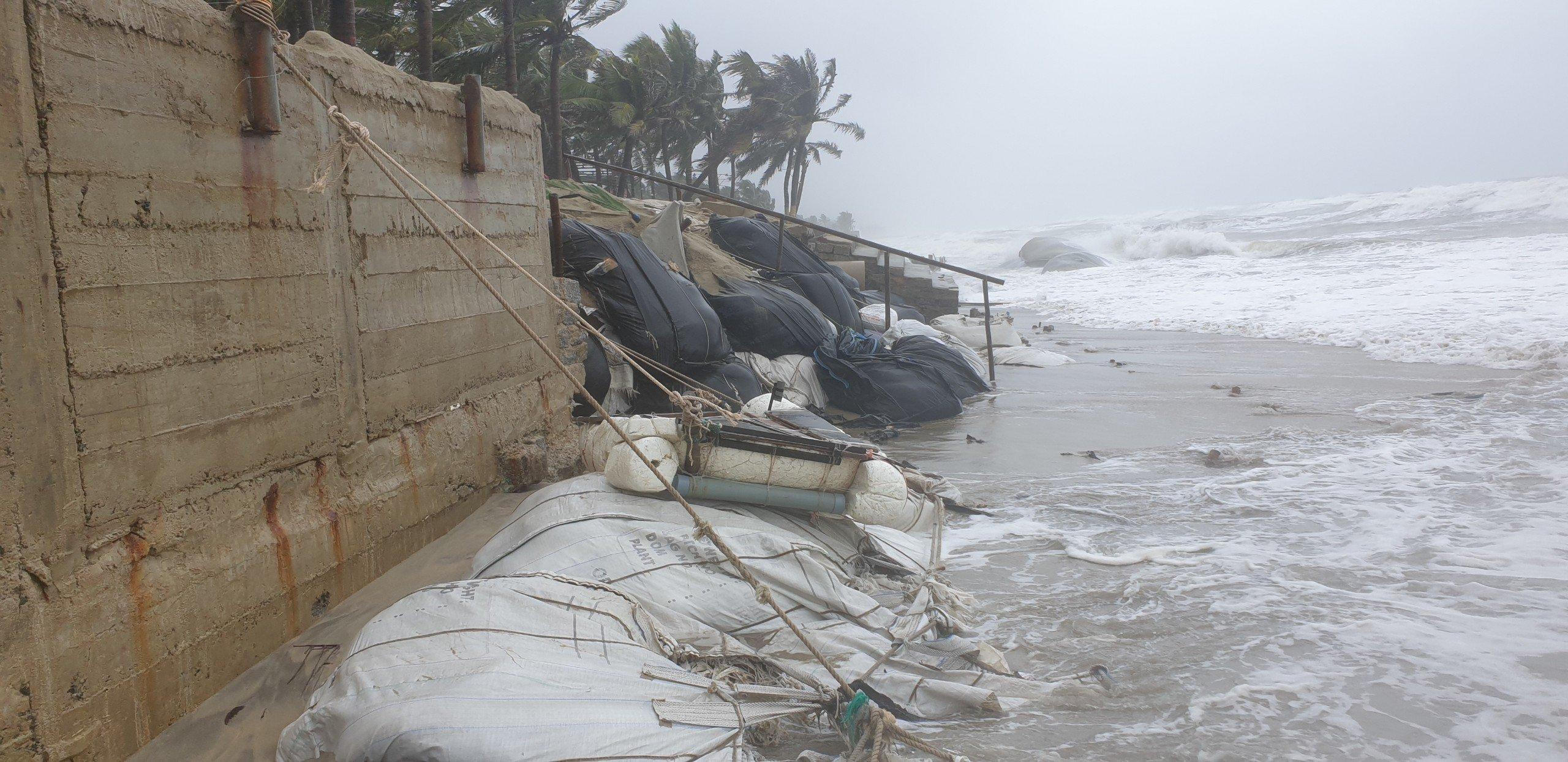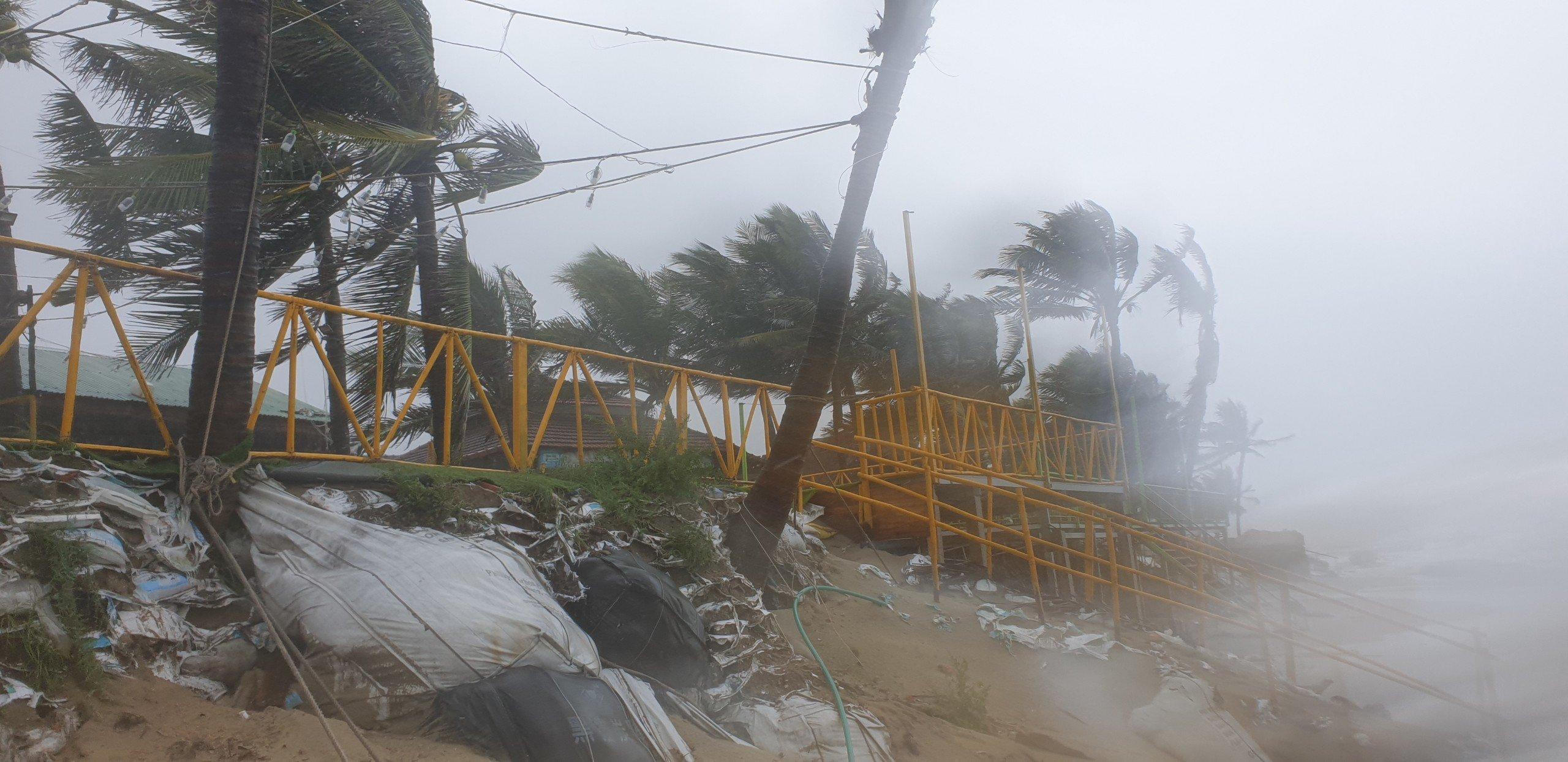 Theo các chủ nhà hàng ven bãi tắm, từ tối qua (10/9), sóng dữ liên tục vỗ xô vào bờ và cuốn trôi nhiều mảng bờ kè bằng bêtông. Hiện tại, từng đợt sóng cao đến 2m đang áp sát một số nhà hàng ven biển. Nhiều người bày tỏ sự lo sợ trước sức công phá dữ dội của sóng biển có thể khiến những đoạn kè tạm bợ như thế này sẽ không trụ vững.
