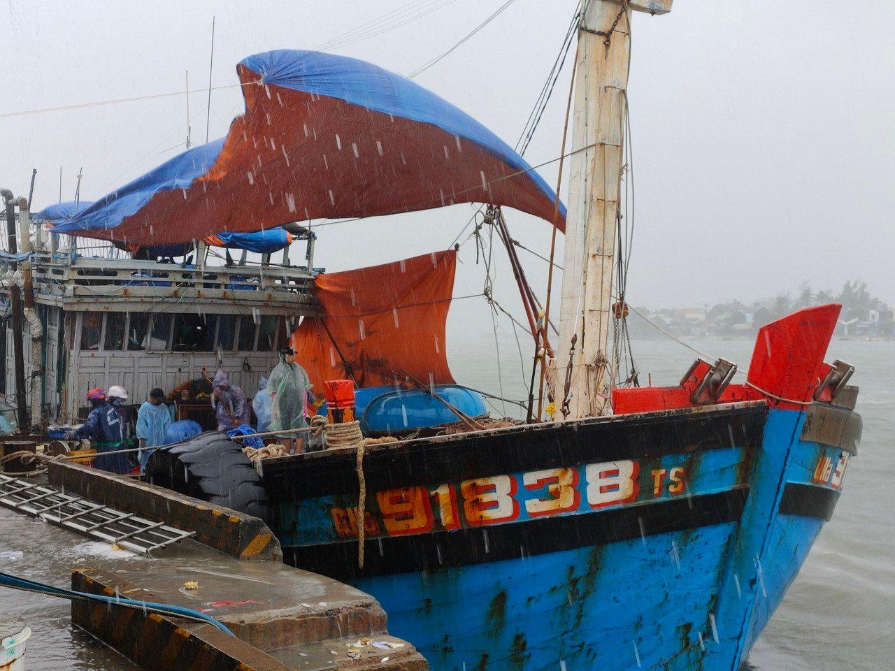 Người dân Quảng Nam đội mưa thu dọn ngư cụ và neo đậu tàu thuyền. |