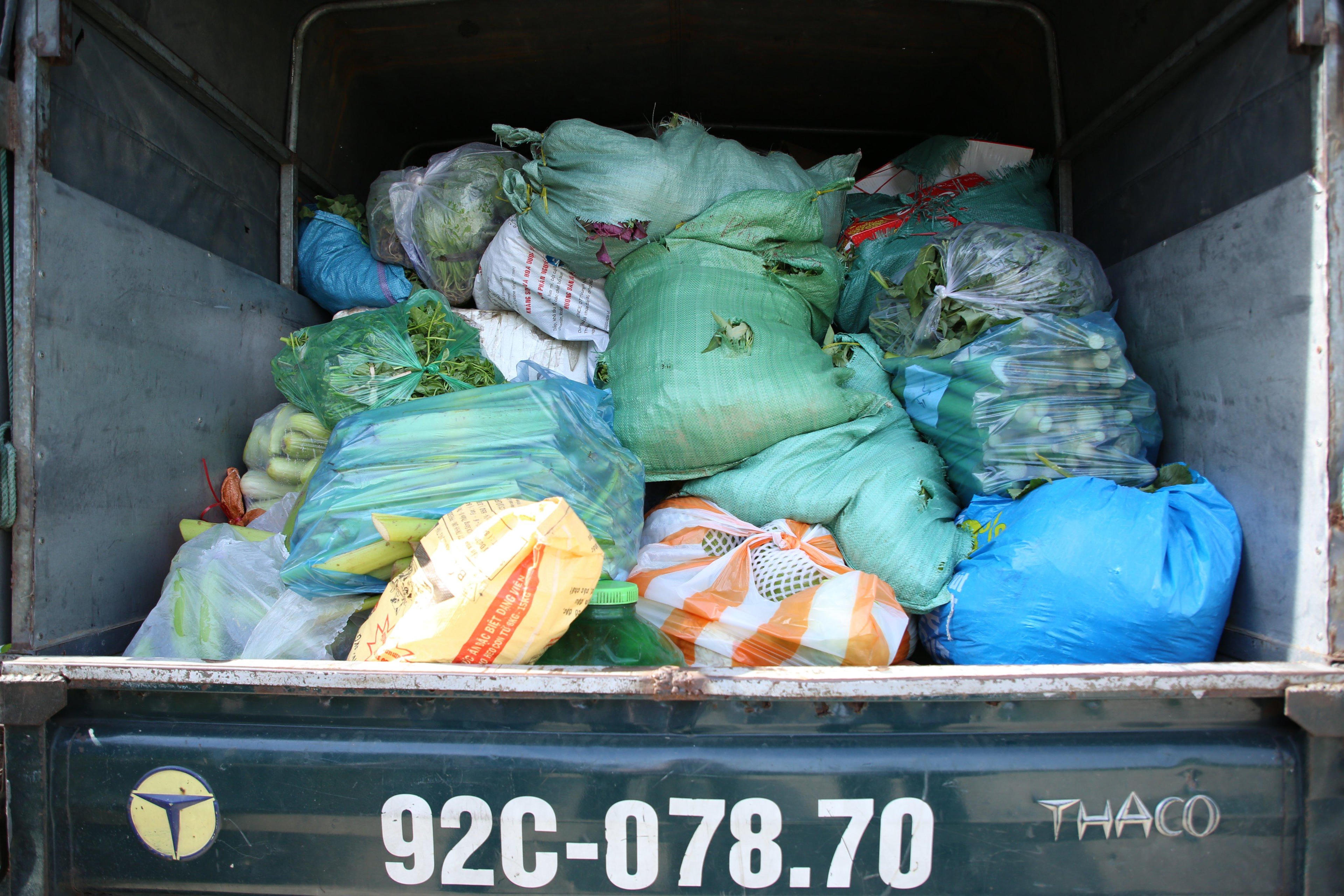 Xe tải xe chở rau củ quả, gạo và nhiều thực phẩm của bà con huyện Đại Lộc (Quảng Nam) tiếp sức người dân khu vực đang bị phong tỏa ở Đà Nẵng. |