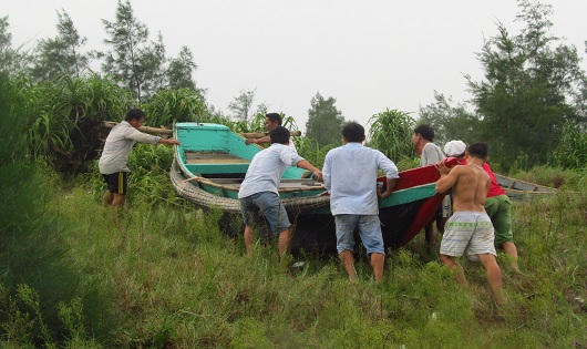 Còn ở vùng biển bãi ngang, những chiếc thuyền cùng lưới và ngư cụ được bà con khoanh vác và kéo, chở vào sâu trong bờ trú ẩn.