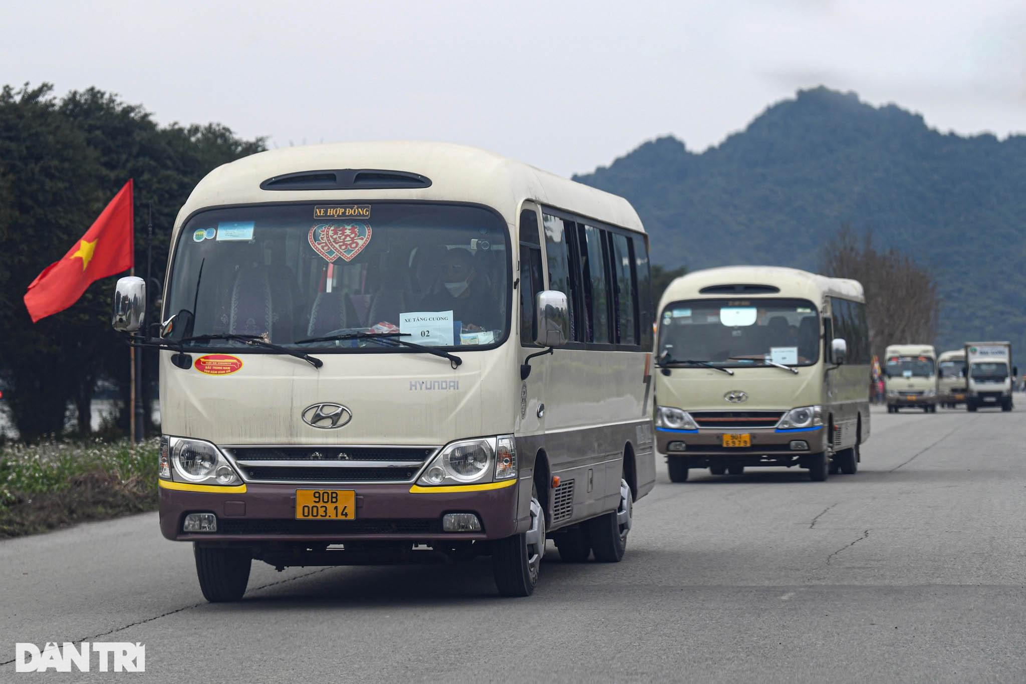Hàng trăm xe điện cùng 20 xe 29 chỗ được điều động, tăng cường để đưa khách từ bên trong chùa ra cổng, tránh đi ngược với dòng người ở chiều vào.
