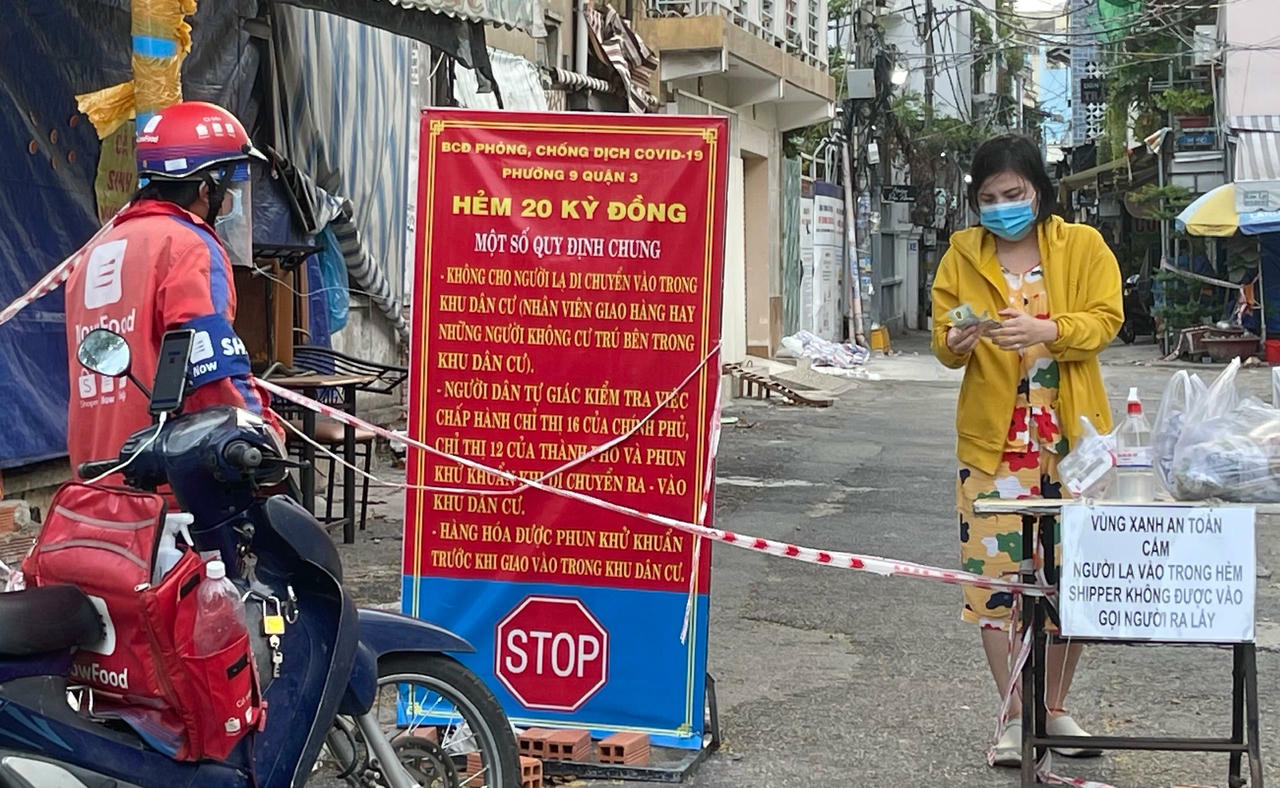 Ghi nhận tại một "vùng xanh" trên đường Kỳ Đồng, ngay chốt kiểm soát phía đầu hẻm, chúng tôi thấy một tấm biển xanh lớn được treo trên hàng rào thép gai, ghi rõ "Người không sinh sống trong khu vực không được ra vào khu dân cư, người giao hàng đứng phía ngoài để giao”, nhằm hạn chế lây lan dịch bệnh từ việc giao nhận hàng hoá hay từ những người không cư trú trong khu dân cư. Tại đây, người dân tự giác chấp hành kiểm tra việc thực hiện Chỉ thị 16 của Chính phủ, Chỉ thị 12 của TP và phun khử khuẩn khi di chuyển ra-vào khu dân cư.