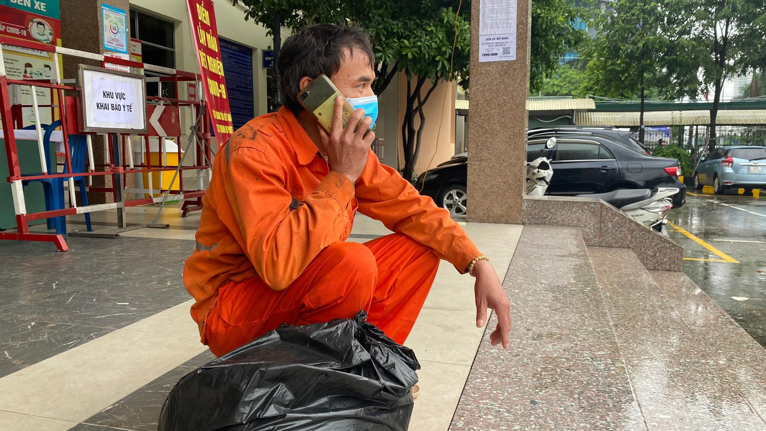 Cũng thời điểm, bên ngoài nhà chờ của Bến xe khách Mỹ Đình, một người đàn ông tên Hà Trọng Hối mặc bộ đồ bảo hộ lao động của công nhân làm việc tại công trường không ngừng bấm điện thoại, hy vọng có xe về quê ở Chợ Đồn, Bắc Kạn.