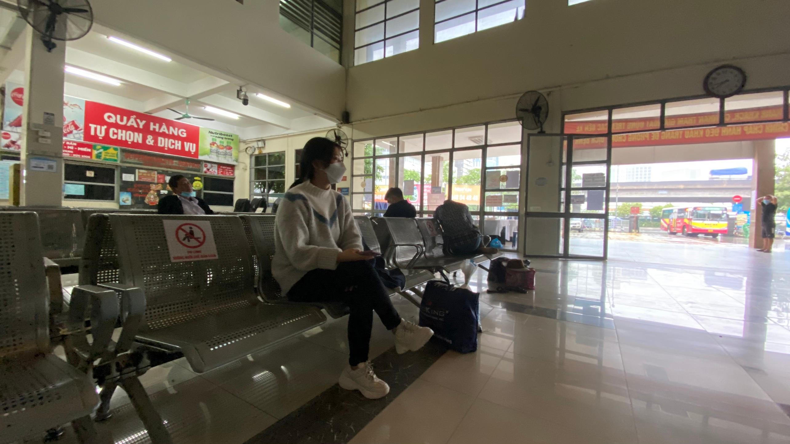 Khách thẫn thờ ngồi tại nhà chờ bến xe khách Mỹ Đình vì không có xe về quê. |