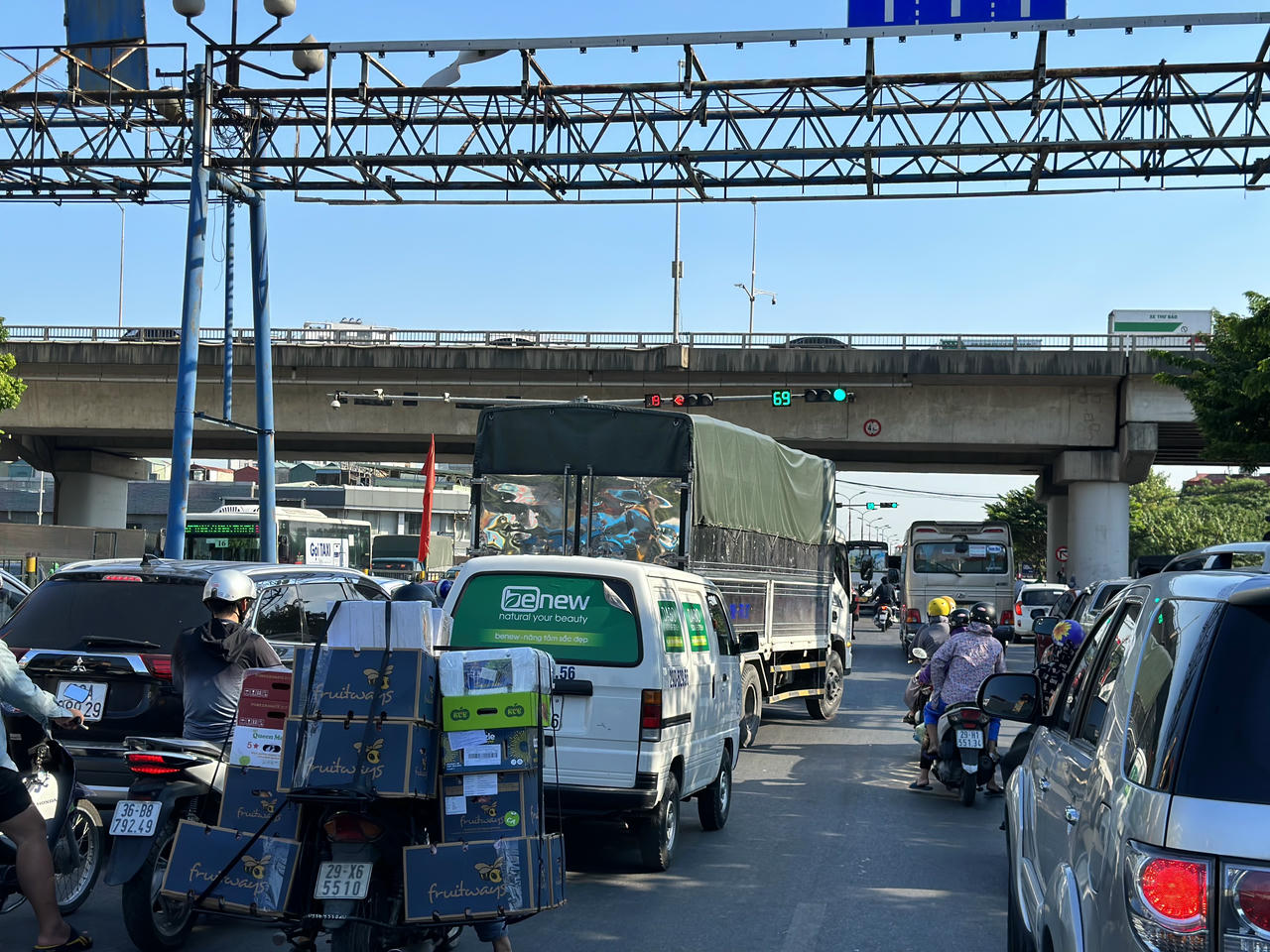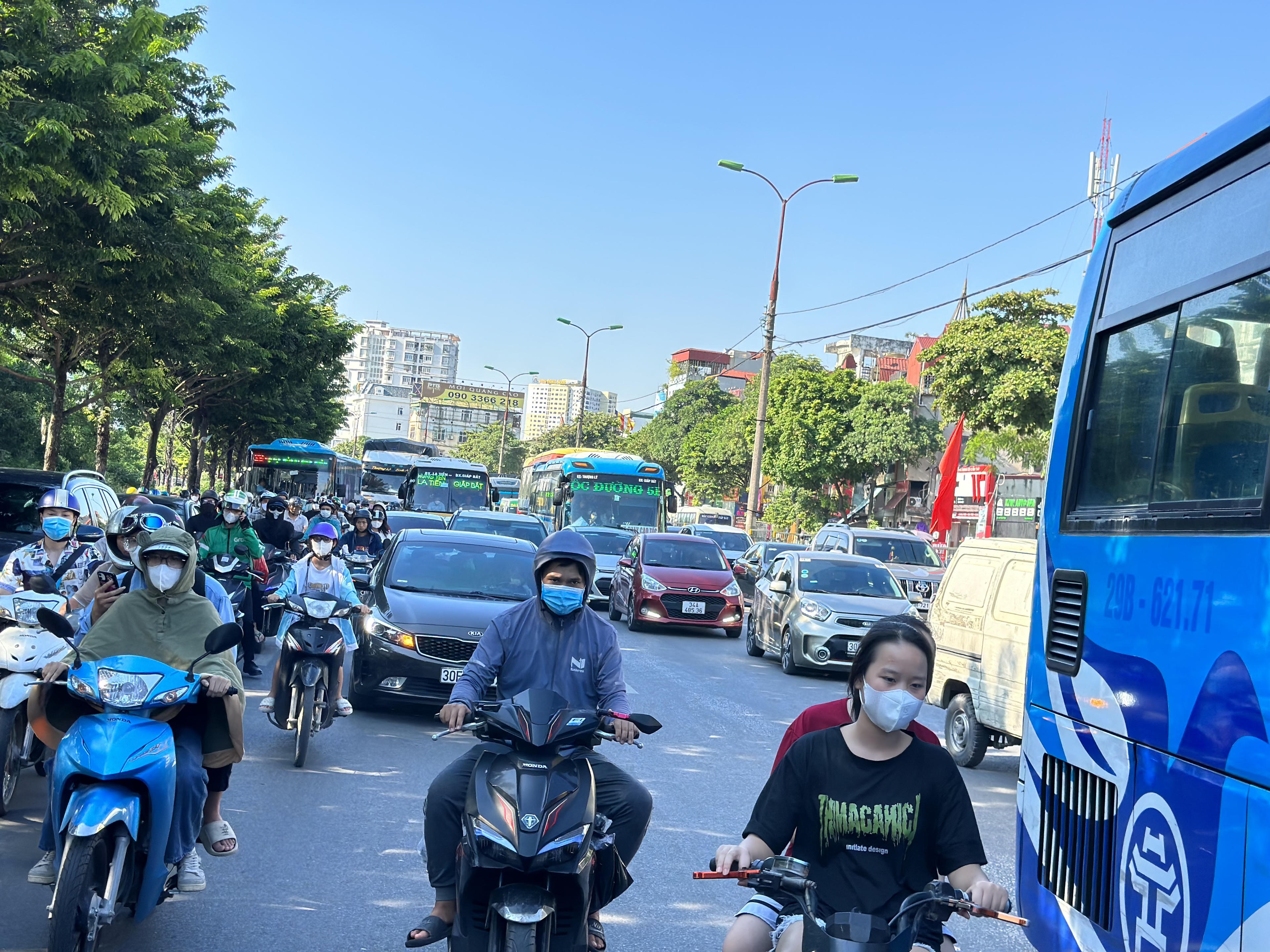 Tuyến đường Giải Phóng, nơi dẫn ra 'cửa ngõ' phía Nam Thủ đô đông nghẹt người và phương tiện. |