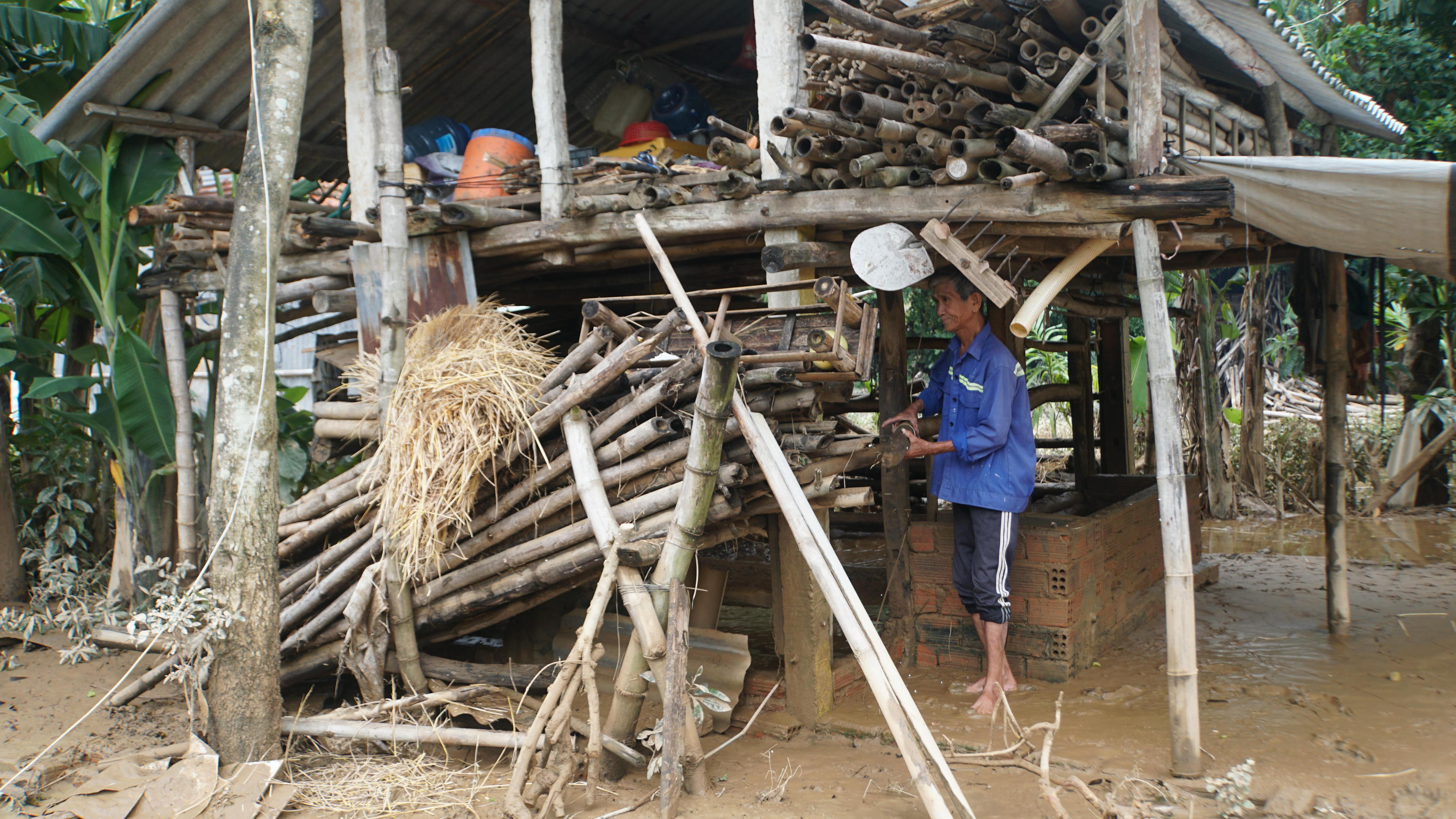 Ông Hồ Văn Hồng vừa di chuyển đồ trên gác lửng xuống vừa cho biết, vợ chồng ông ở trên đó 3 ngày rồi, có gì ăn nấy. Giờ nước rút hết mới tranh thủ dội nước dọn nhà, dọn sân.