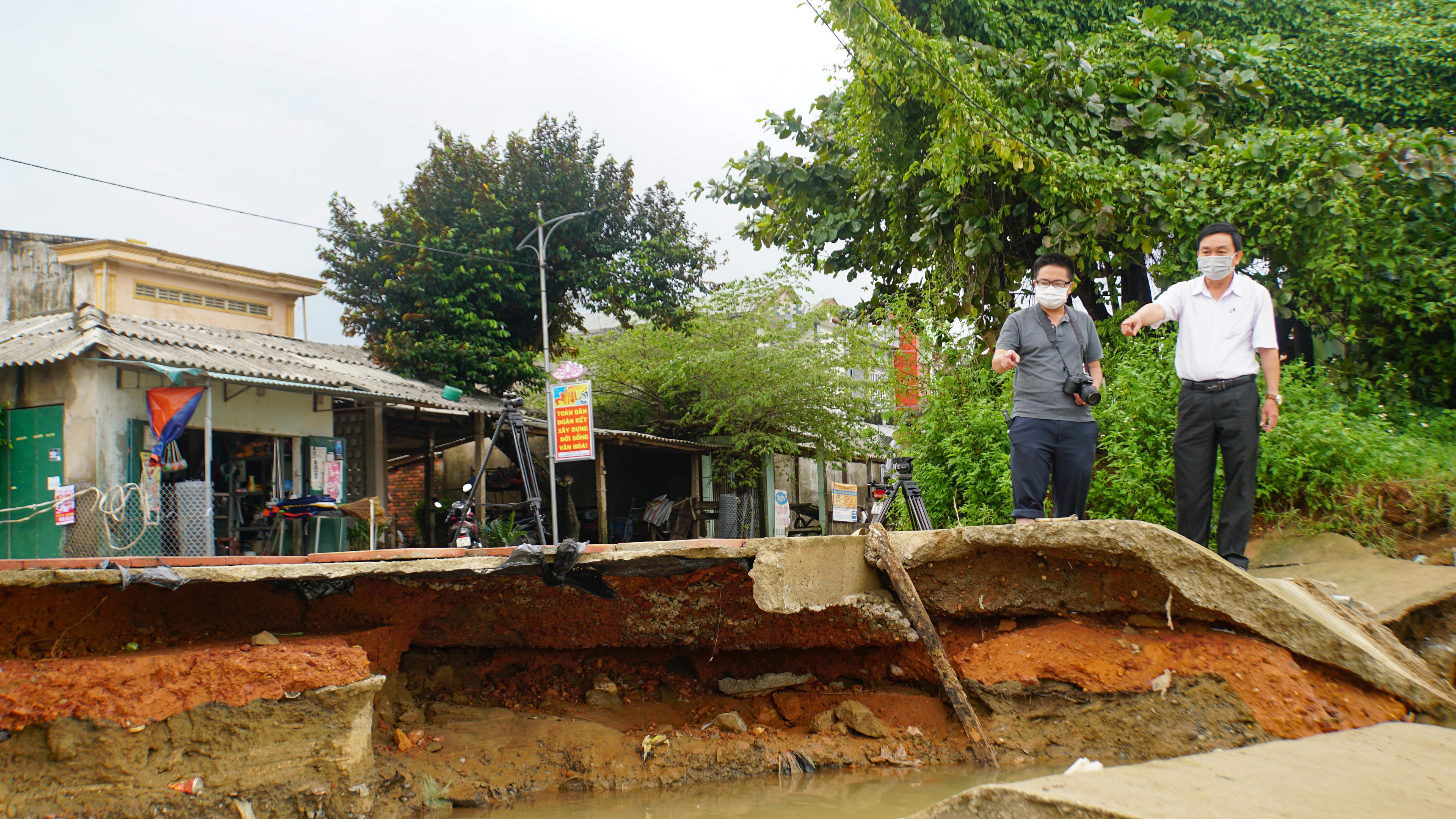 Theo con đường bê tông, đi sâu vào xóm Soi, nước vẫn còn ngang bắp chân. Hai bên đường, bùn non còn đọng dày trên cỏ, trong vườn và cả trên hàng rào ngang cổ, ngang ngực người đi. Mấy người đang tát nước, gạt bùn, dọn cây và làm vệ sinh hai bên đường.