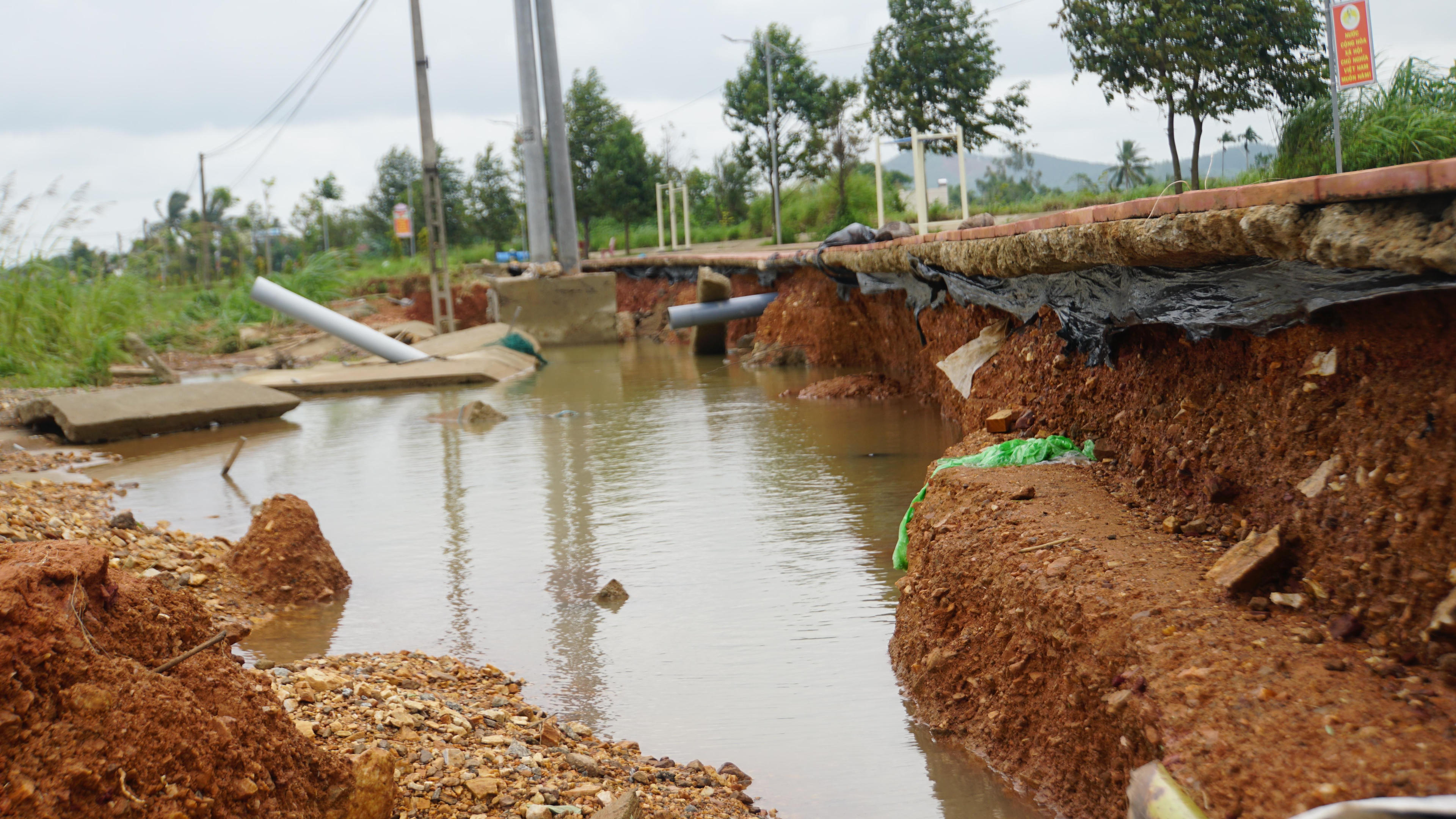 Nước lũ chảy xiết làm hư hỏng, sạt lở gần 100 mét vỉa hè. |