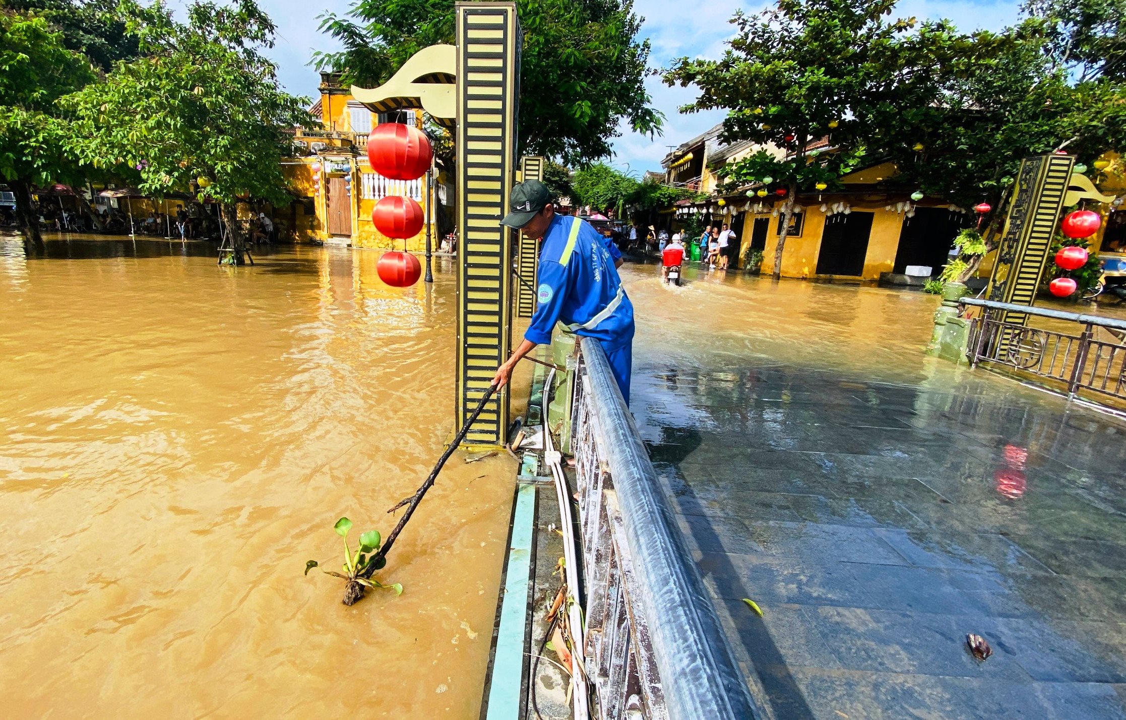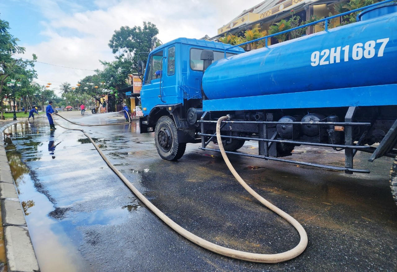 Công nhân Công ty Cổ phần Công trình công cộng Hội An cũng được huy động để tổng dọn vệ sinh sau lũ.