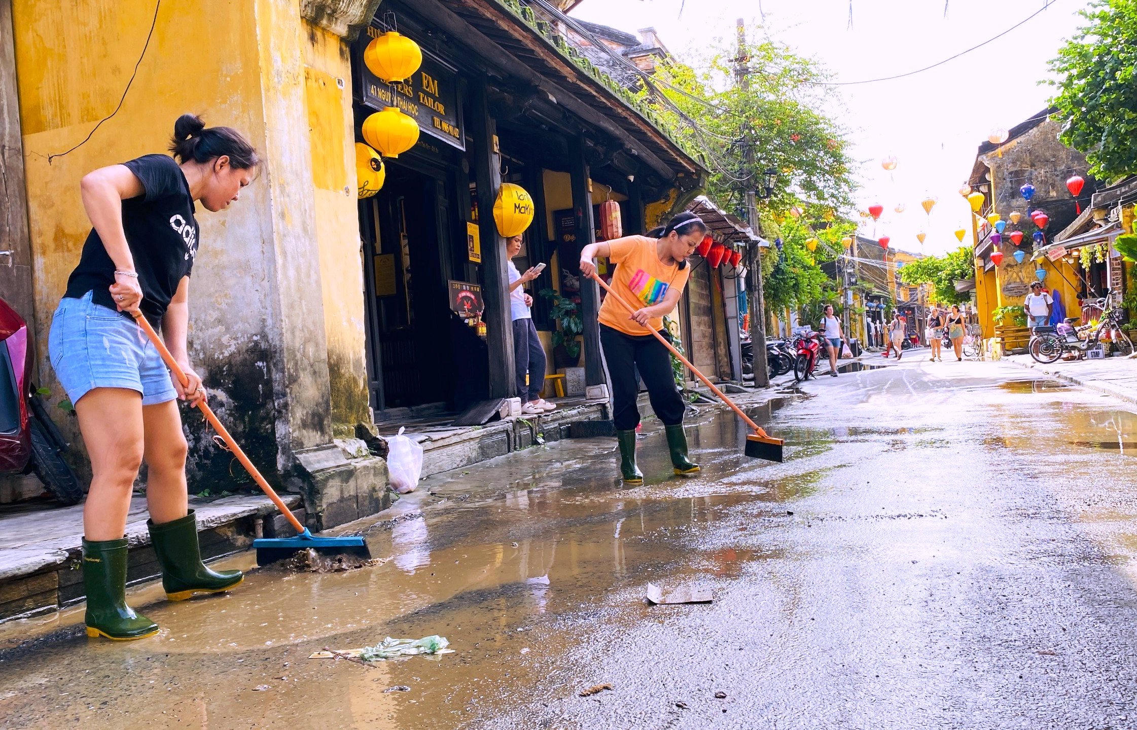 Tranh thủ lũ rút, nhiều người dân phố cổ Hội An xắn quần, chung tay dọn bùn non, rác thải theo phương châm “nước rút đến đâu dọn dẹp đến đấy”.
