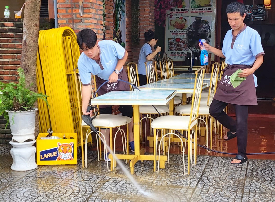 Nhân viên một cửa hàng ăn uống, dội bùn non, lau chùi bàn ghế mở cửa đón khách.