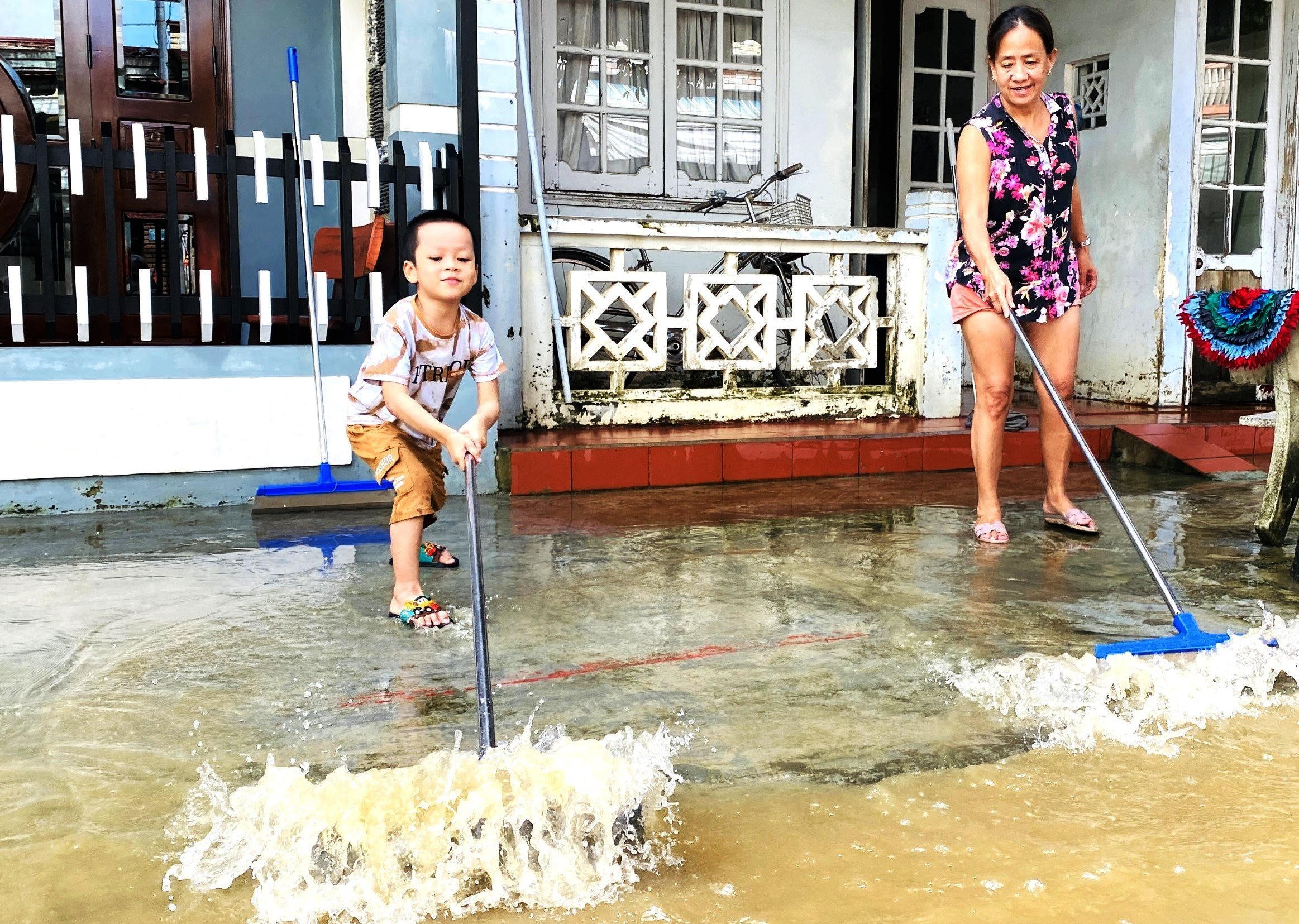 Người dân sinh sống trên đường Lưu Quý Kỳ, khối An Hội, cũng dọn vệ sinh nhà cửa, dội bùn ra ngoài đường để trở lại với cuộc sống sinh hoạt thường nhật.