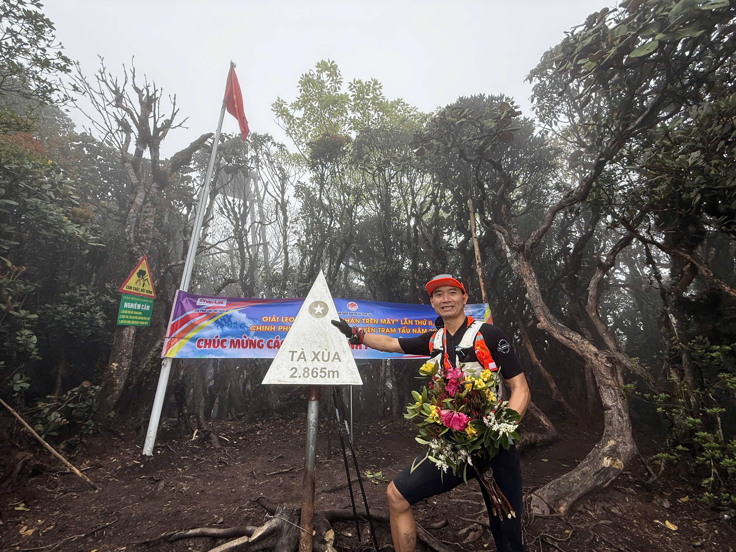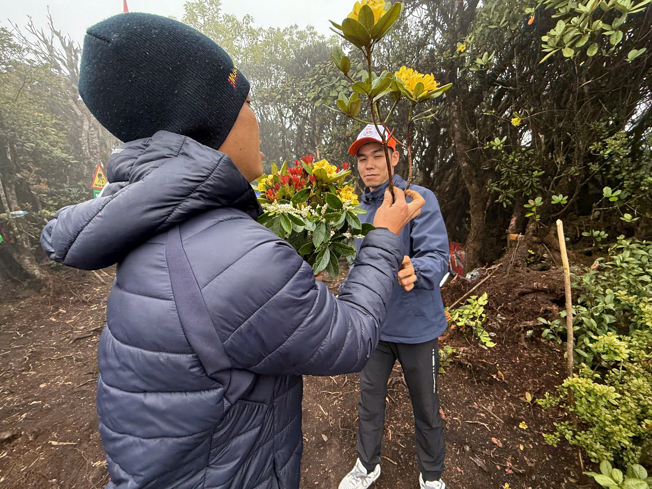 Trước đó, các thành viên Ban tổ chức, chủ yếu là nam giới, đợi sẵn ở đỉnh Tà Xùa, đã kỳ công kết những bó hoa rực rỡ, được chọn từ cây đỗ quyên và các cây trên núi, đón mừng vận động viên về đích.