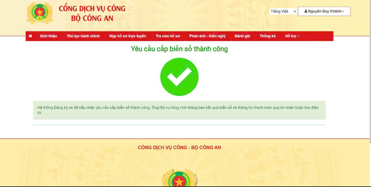 Giao diện đăng ký thành công bằng hình thức đăng ký qua dịch vụ công trực tuyến toàn trình |
