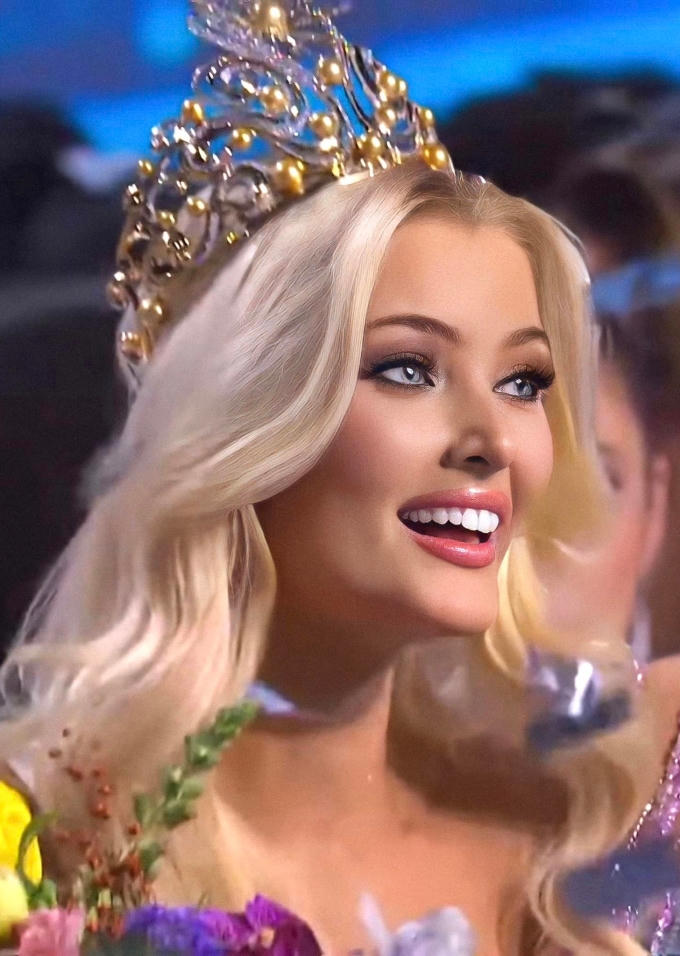 Tân Hoa hậu Hoàn vũ cao 1m73, sở hữu gương mặt đẹp như búp bê, đôi mắt xanh thu hút cùng mái tóc vàng óng ả. Người đẹp 21 tuổi là ca sĩ, vũ công, từng đoạt giải vô địch châu Âu và giải vô địch thế giới.