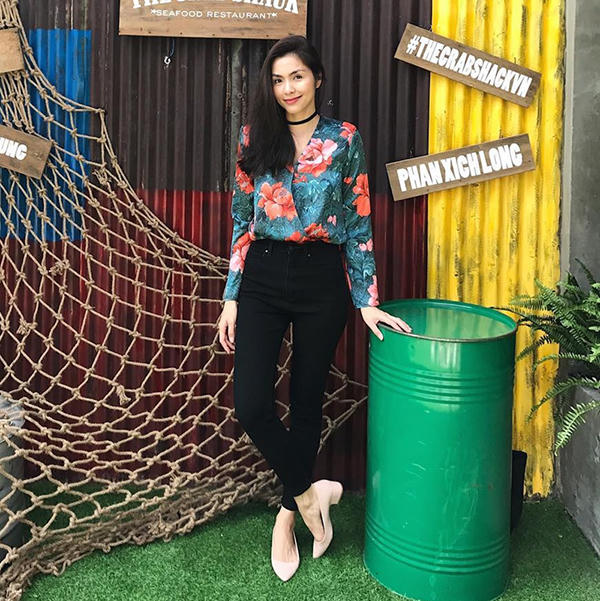 Áo trễ vai in hoa lãng mạn được siêu mẫu đình đám của làng thời trang Việt phối hợp cùng quần jean đơn giản, tiện dụng.