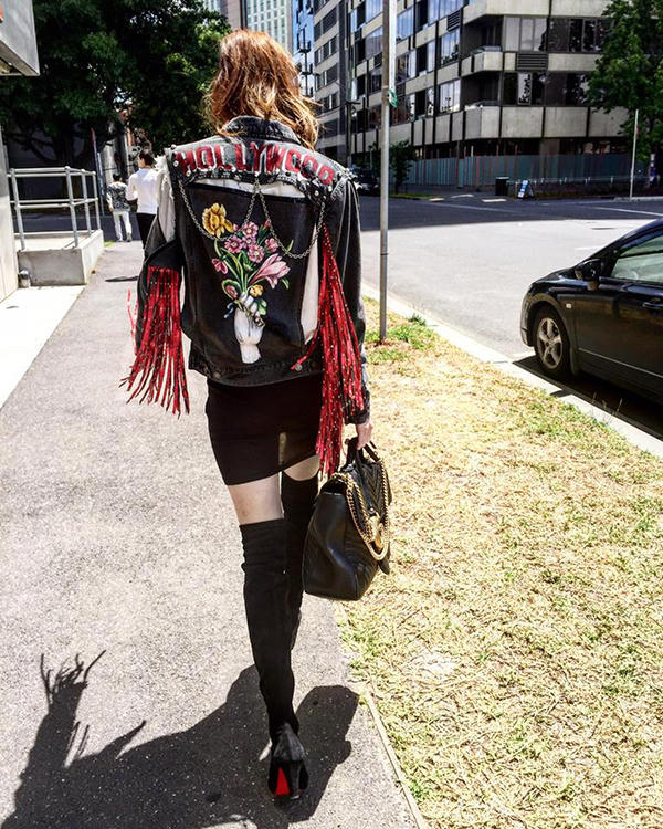 Ngoài sơ mi, Hồ Ngọc Hà còn chọn thêm áo khoác jean trang trí hoạ tiết bắt mắt để thể hiện độ dành điệu với hot trend mùa mới.