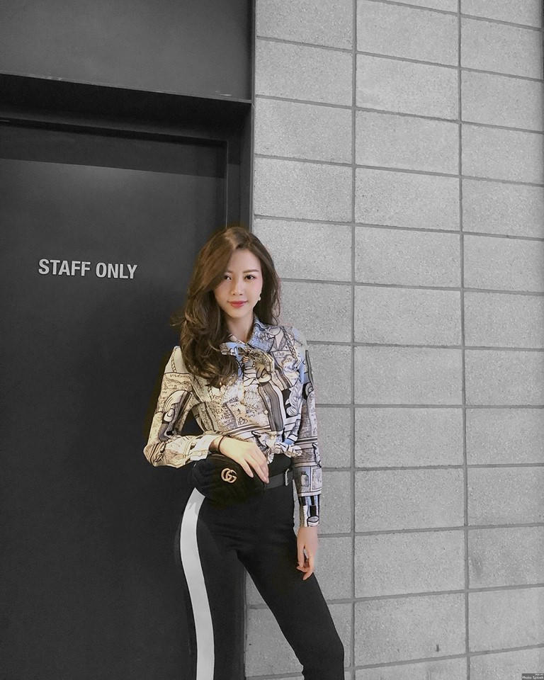Người đẹp The Look - Vũ Ngọc Châm sành điệu khi diện áo sơ mi họa tiết comic cùng quần tây kẻ sọc và túi xách thắt lưng Gucci. Mái tóc uốn xoăn là cách giúp cô cân bằng lại vẻ nữ tính trên gương mặt.