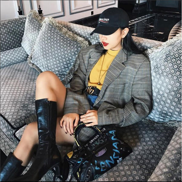 Châu Bùi luôn chứng tỏ sức hút của một "IT Girl" thời trang, khi luôn mang đến những set đồ độc đáo. Người đẹp lựa chọn mẫu áo blazer kẻ ô độn vai làm điểm nhấn trên bộ trang phục cá tính. Cô khéo léo đồng điệu màu sắc giữa áo thun cùng họa tiết trên chiếc túi xách graffiti của Balenciaga.