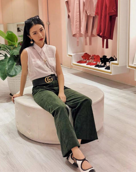 Quỳnh Anh Shyn mang đến hình ảnh một cô gái cổ điển, khi diện áo sơ mi chất liệu linen cùng quần ống suông vải nhung và nhấn nhá bằng đôi giày cao gót trắng viền đen tinh tế.