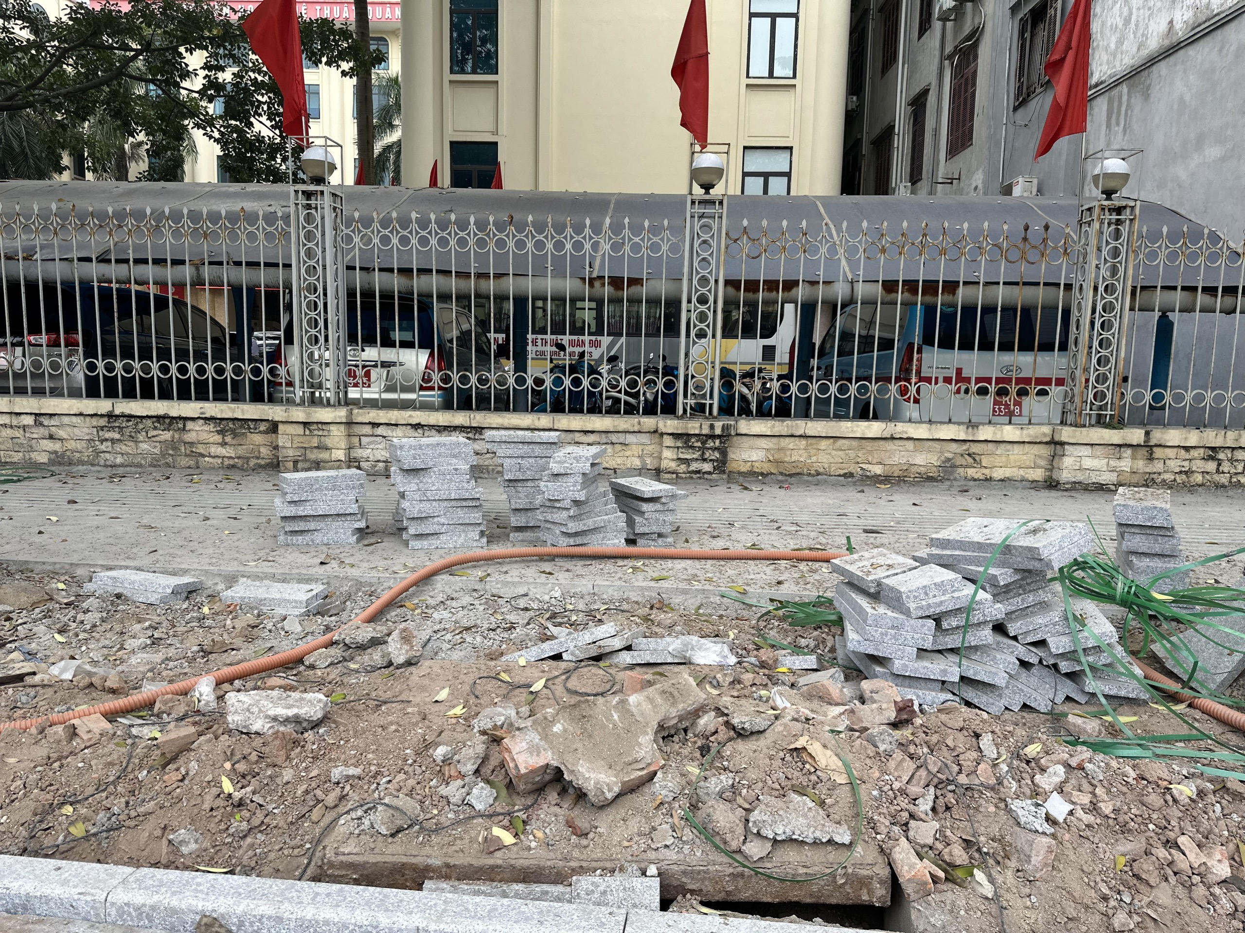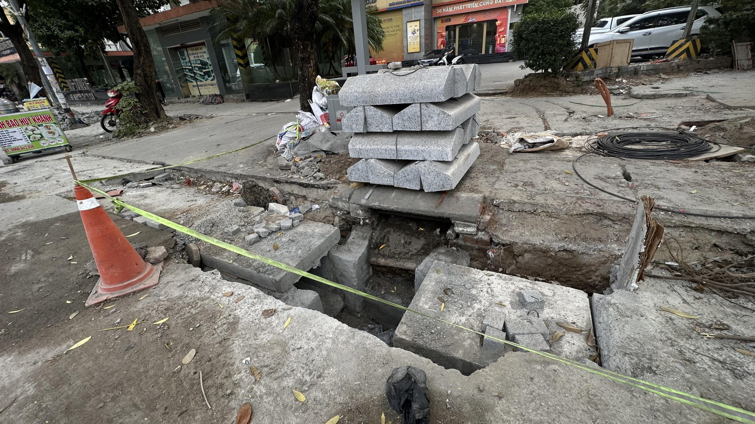 Gạch lát vứt ngổn ngang trên vỉa vè |