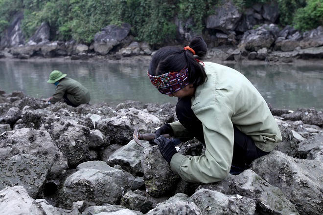 Còn anh Nguyễn Đăng Chỉnh làm nghề xây dựng nhà ở phường Hồng Hải (Hạ Long) thường đi dọc bãi đá ven biển đục hà để cải thiện bữa ăn gia đình.