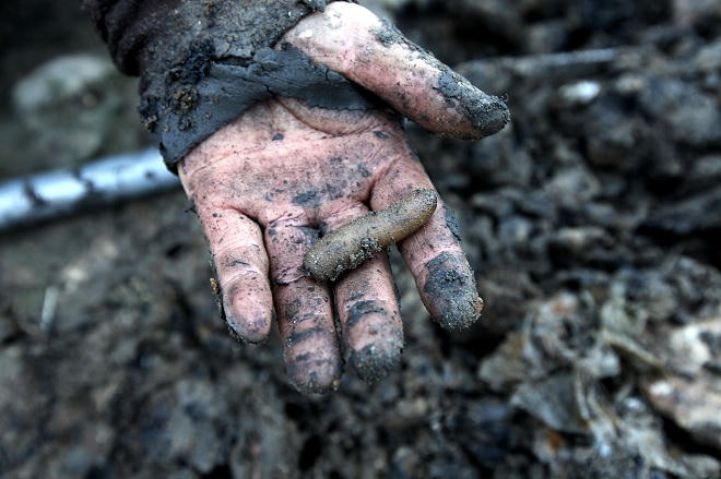 Chỉ với chiếc xẻng và một cái xô, người phụ nữ này đi dọc bãi đá ven biển tìm kiếm, đào trùn biển để cải thiện bữa ăn cuối tuần của gia đình.
