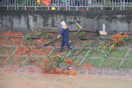 | Một công nhân vệ sinh xử lý cành cây gãy do mưa lớn bên rìa sông Tô Lịch |