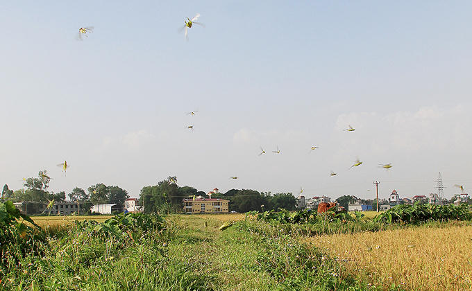 Những ngày này, châu chấu bay rợp trời trên các cánh đồng thuộc huyện Phú Xuyên, Mỹ Đức (Hà Nội), người dân địa phương thường gọi đây là "tôm bay".