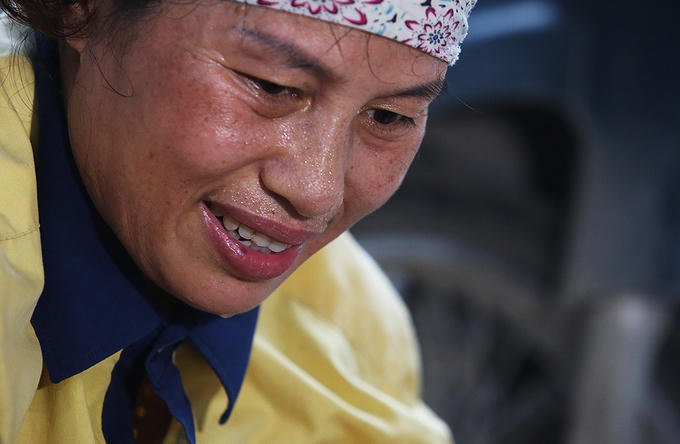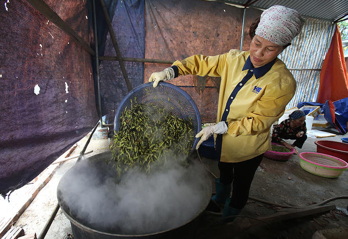 "Mỗi ngày tôi đi xe máy hàng chục cây số để thu mua châu chấu, đưa về lại còn vào bếp để sơ chế trong thời tiết nắng nóng 38-39 độ C", bà Hoa vừa nói vừa lau mồ hôi đang túa ra trên khuôn mặt.