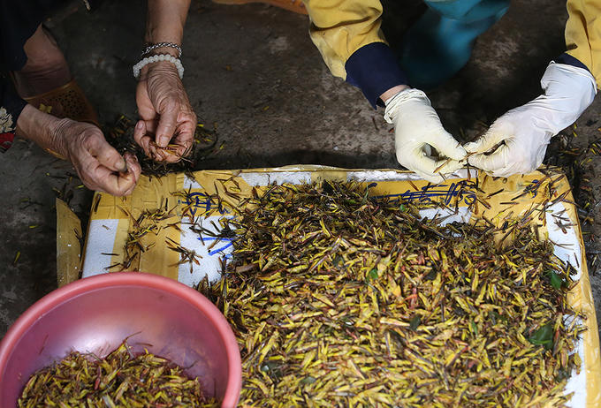 Châu chấu khi mua về được ngâm để làm sạch, rồi luộc trong khoảng 5 phút và nhặt bỏ cánh chân.