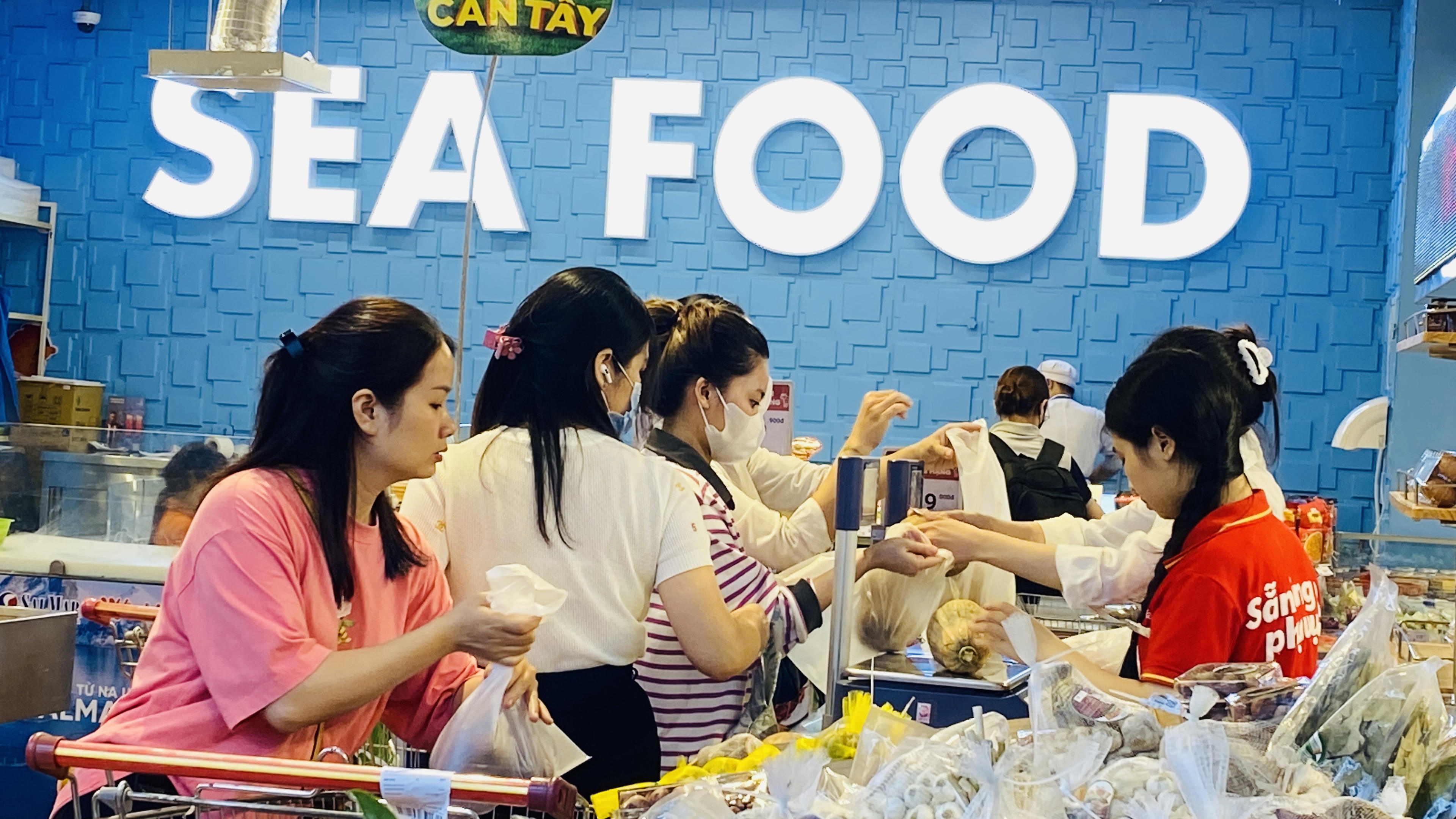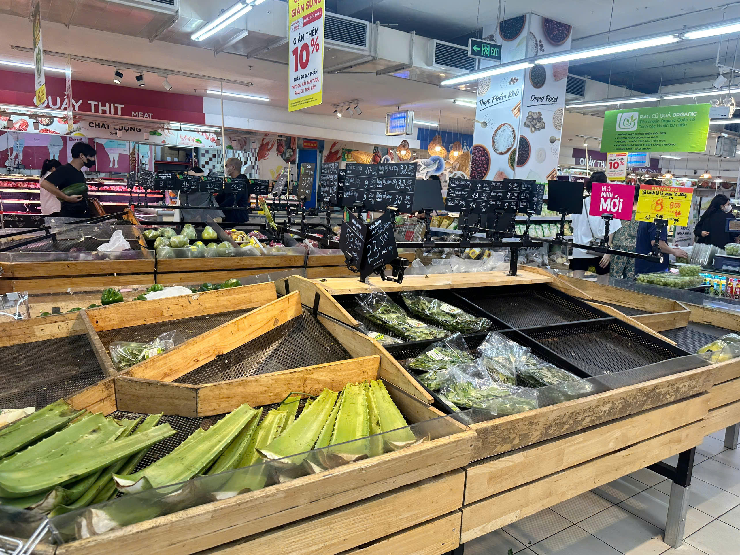 Tại Tops Market The Garden, các kệ rau xanh, thịt lợn và bánh mì cũng hết sạch hàng. Kệ mì tôm và một số thực phẩm khô cũng vơi đi rất nhiều. Và tại quầy thanh toán, người dân xếp hàng dài chờ đợi, nhiều người với giỏ hàng đầy ắp những thực phẩm khô và tươi.