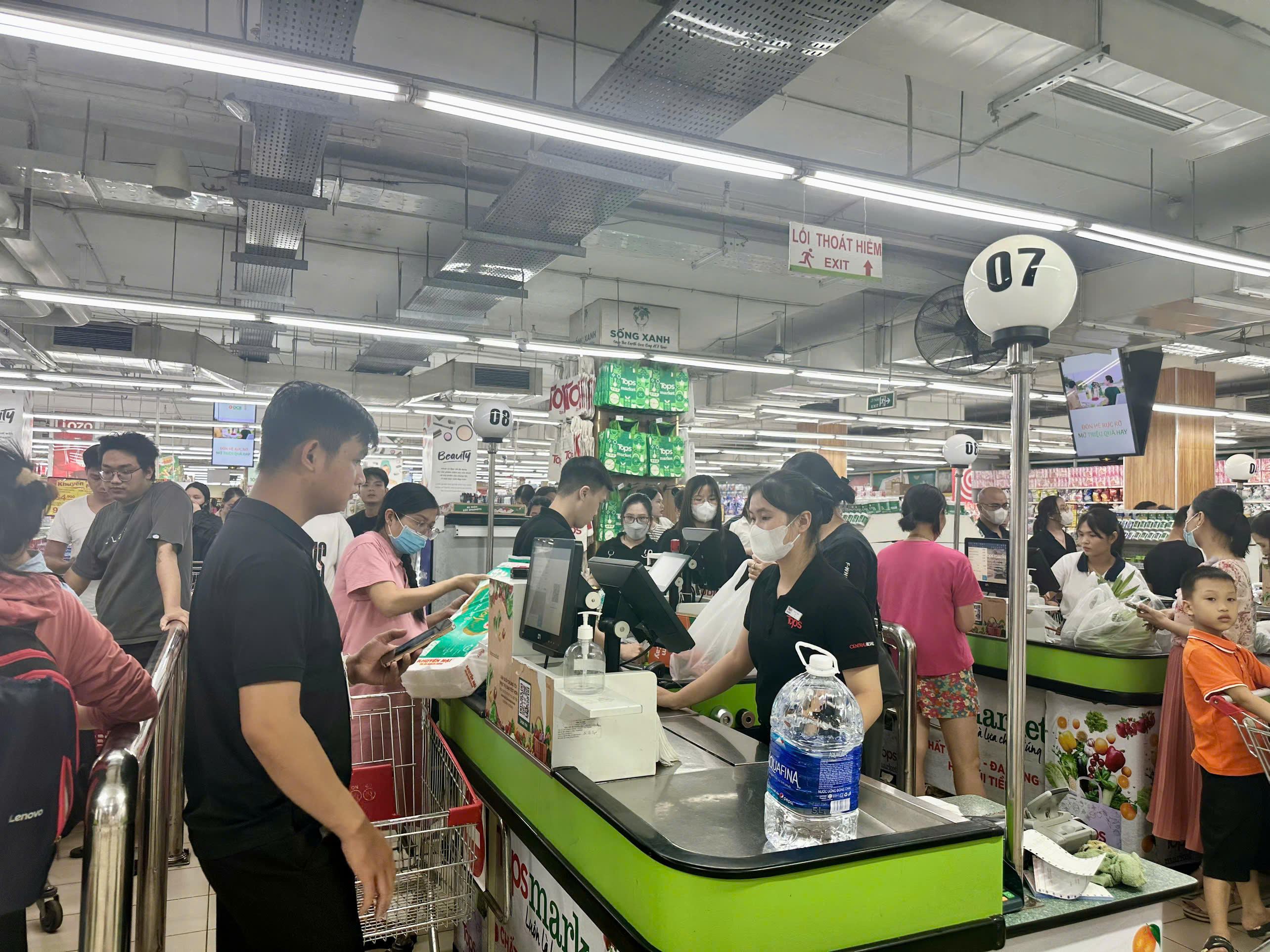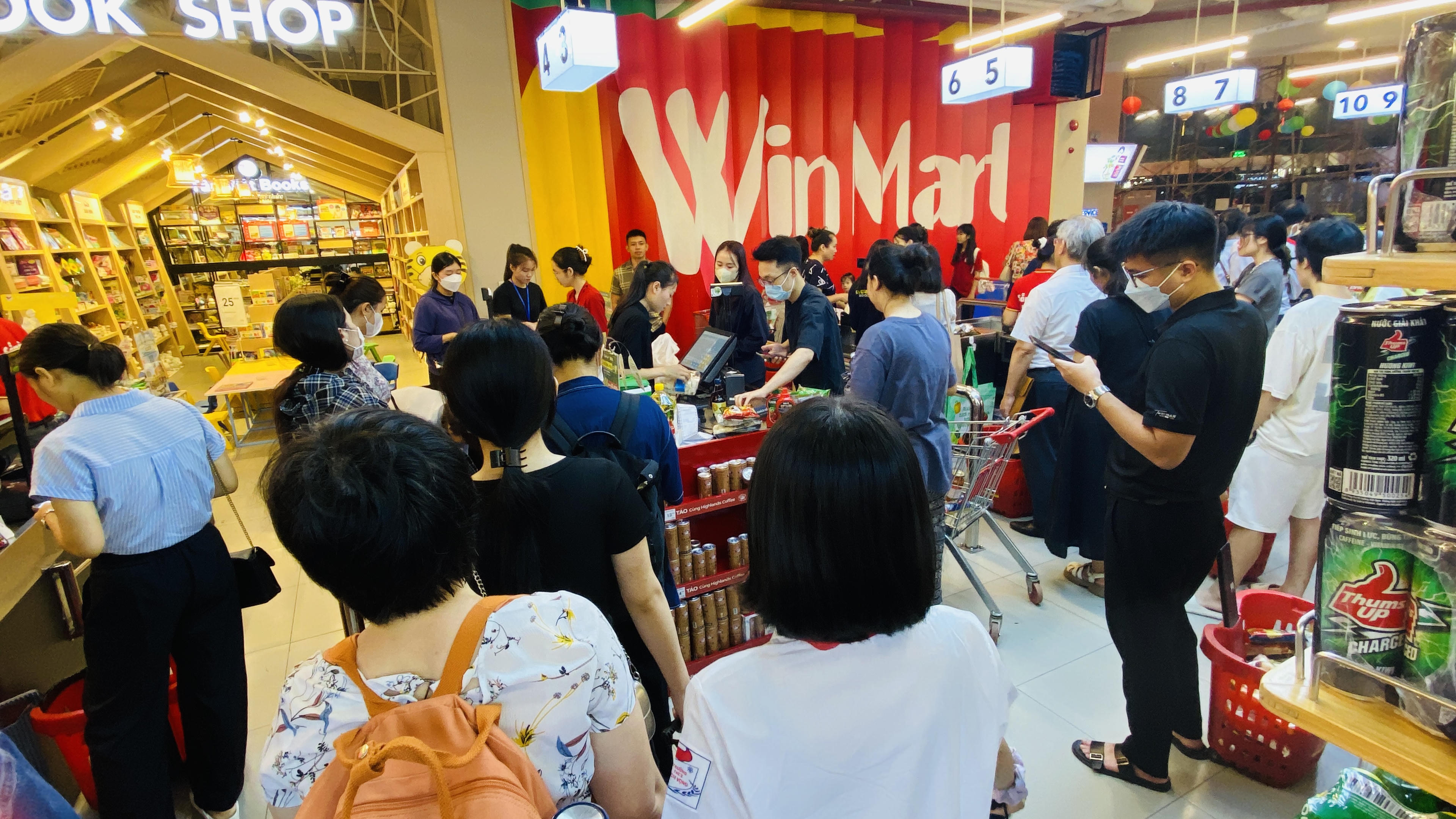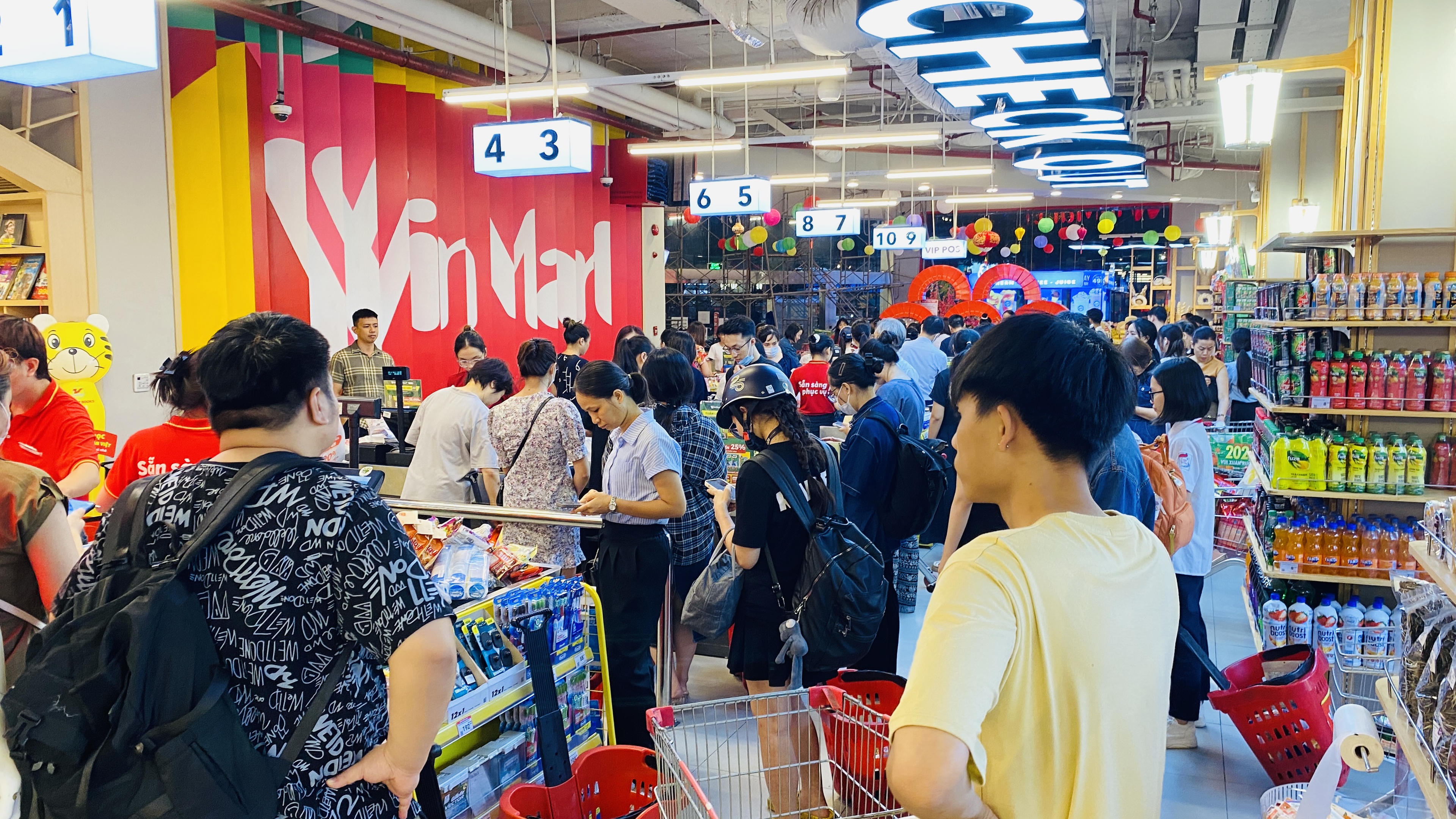 Người dân chờ thanh toán tại quầy ở siêu thị Winmart Thăng Long. |