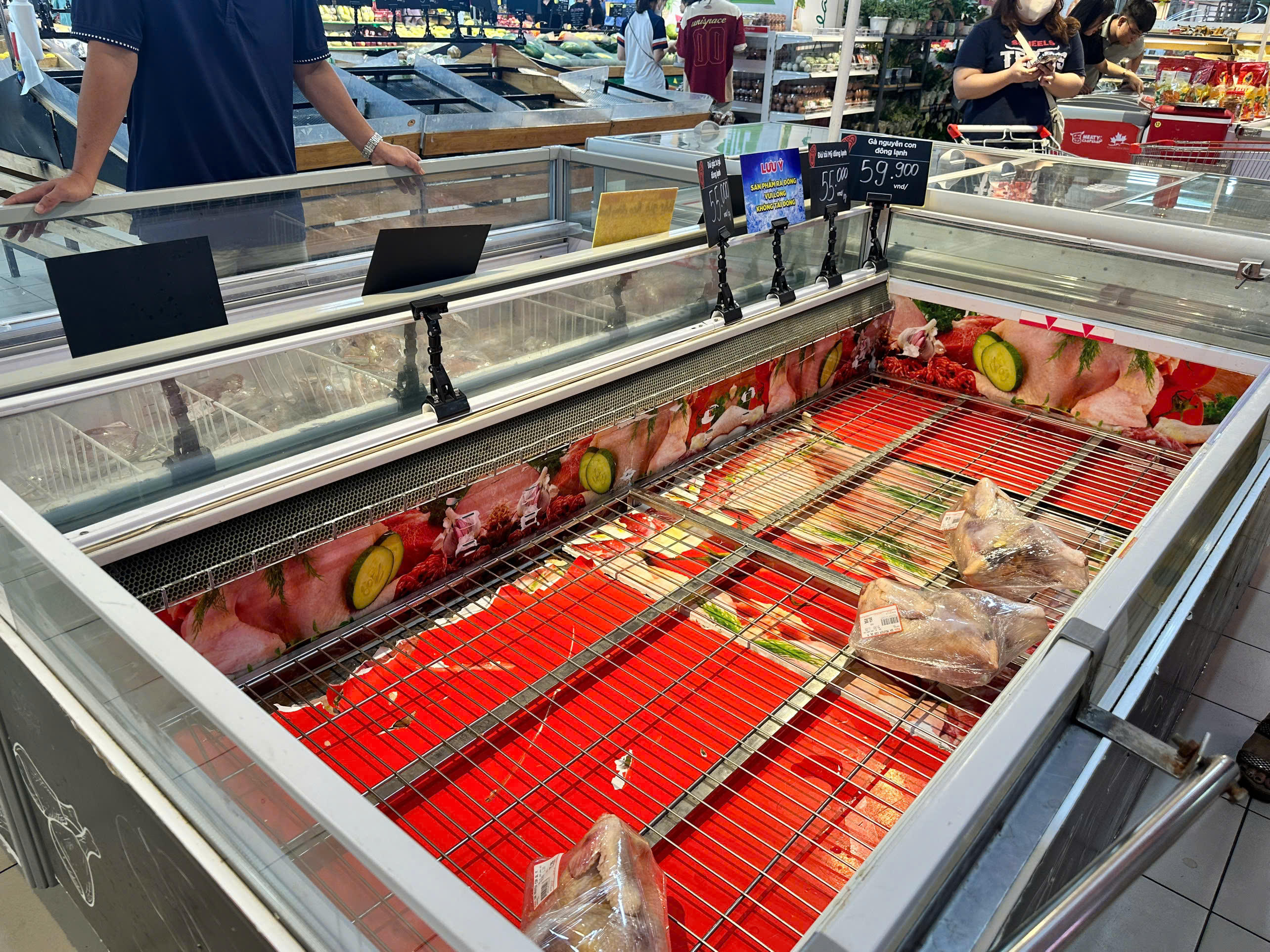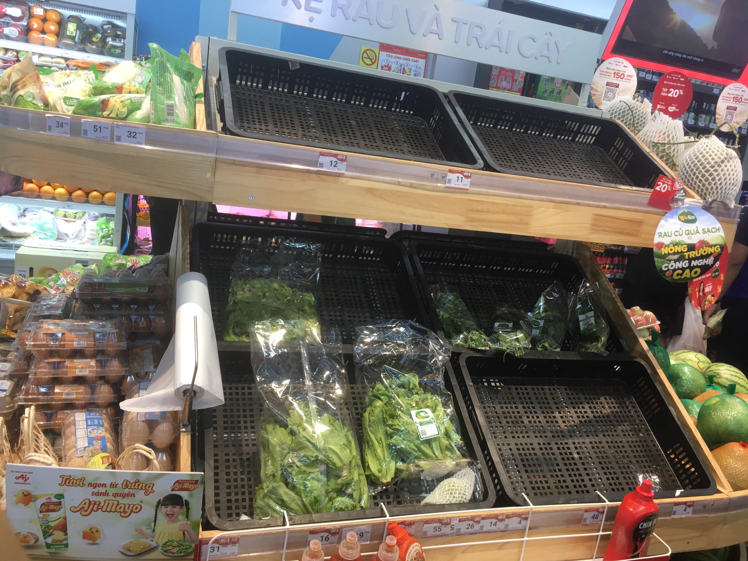 Cửa hàng Winmart+ trên đường Nguyễn Khánh Toàn (Cầu Giấy, Hà Nội) kệ hàng thịt tươi và rau củ quả cũng vơi gần hết. |