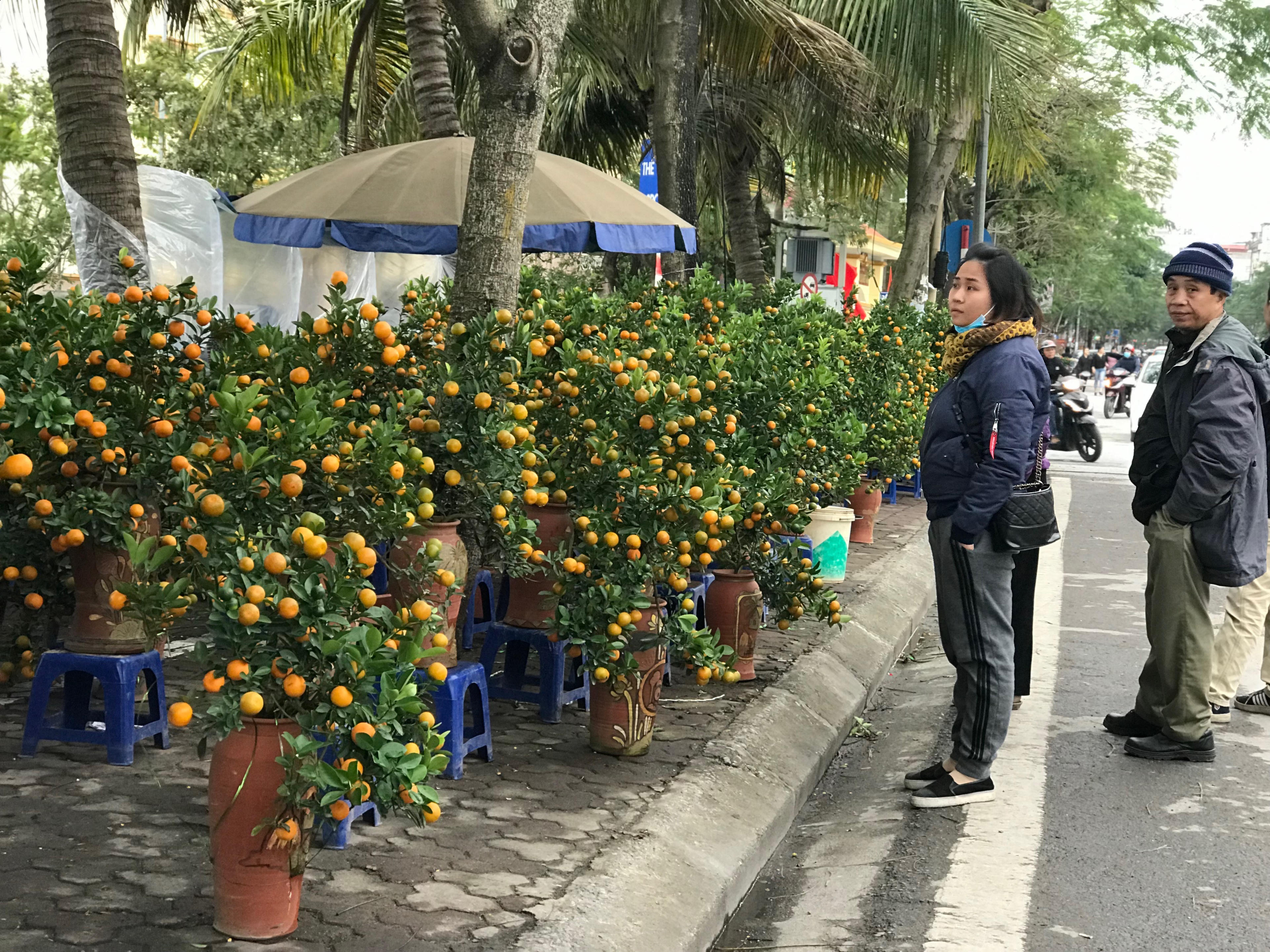 Tết đến, xuân về, phần lớn các gia đình Hà thành không thể thiếu cành đào, chậu quất - những cây mà theo quan niệm dân gian mang phúc lộc đến nhà bởi cảnh lá xum xuê, có quả xanh, quả chín, nhánh non... Quất được bày bán dọc đường Lạc Long Quân với giá dao động, cây nhỏ trung bình 300.000 đồng/chậu, cây lớn 1 triệu - 4 triệu đồng/chậu.