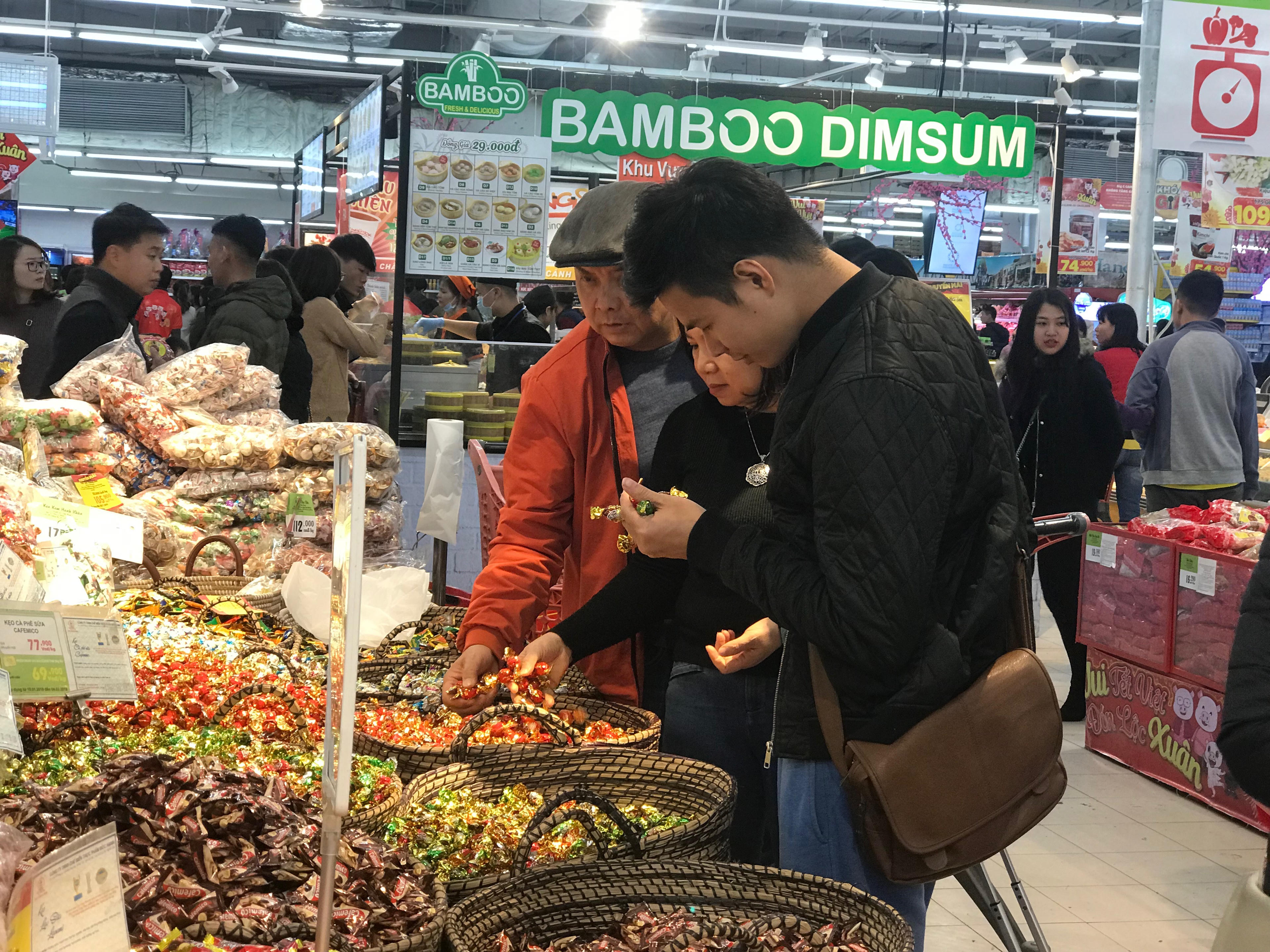 Kệ hàng trong các siêu thị đua nhau treo biển giảm giá và người dân mua sắm vô cùng nhộn nhịp. Những mặt hàng "chạy" nhất là bánh kẹo, hoa quả, quần áo.