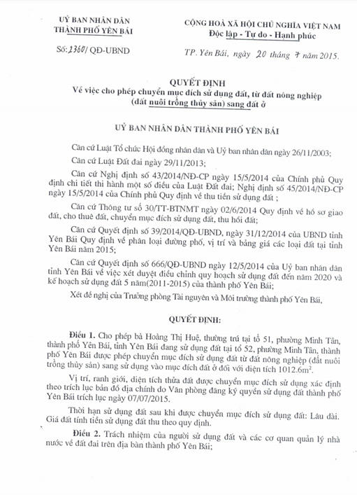 Bắt đầu từ ngày mùng 2/7/2015 gia đình bà Huệ có đơn xin chuyển đổi mục đích sử dụng đất lên UBND TP Yên Bái.