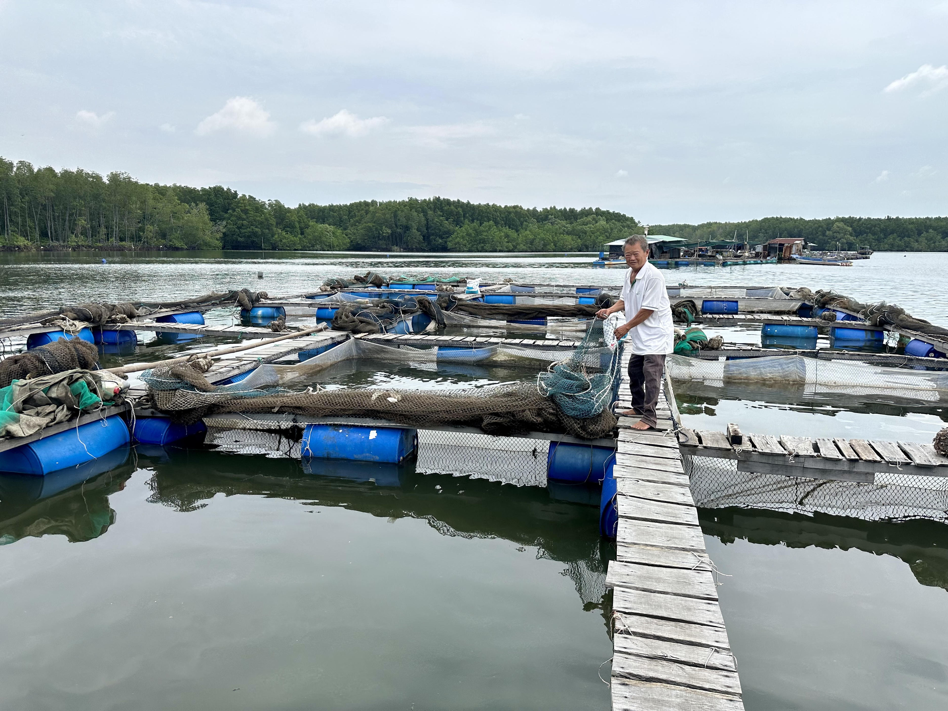 Ông Hồ Văn Hùng bên cạnh lồng cá đã kéo hẳn lưới lên vì không còn cá. |