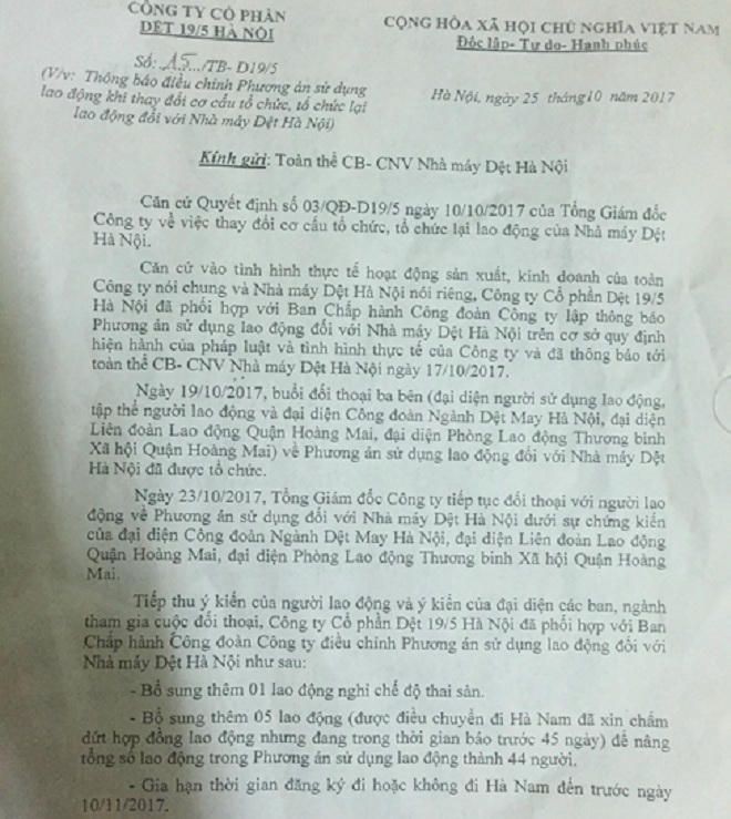 Sau hai buổi đối thoại ba bên giữa người lao động, người sử dụng lao động và Công đoàn (diễn ra ngày 19/10 và 23/10), Công ty Cổ phần Dệt 19/5 Hà Nội phối hợp với Ban Chấp hành Công đoàn Công ty đã quyết định điều chỉnh Phương án sử dụng lao động đối với công nhân Nhà máy Dệt.