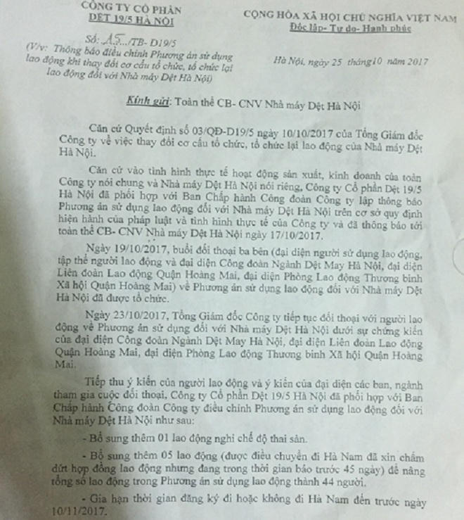 Theo đó, bổ sung thêm 1 lao động nghỉ chế độ thai sản, 5 lao động (được điều chuyển đi Hà Nam đã xin chấm dứt hợp đồng lao động nhưng đang trong thời gian báo trước 45 ngày) để nâng tổng số lao động trong Phương án sử dụng lao động thành 44 người. Công ty cũng gia hạn thời gian đăng ký đi hoặc không đi Hà Nam đến trước ngày 10/11/2017.