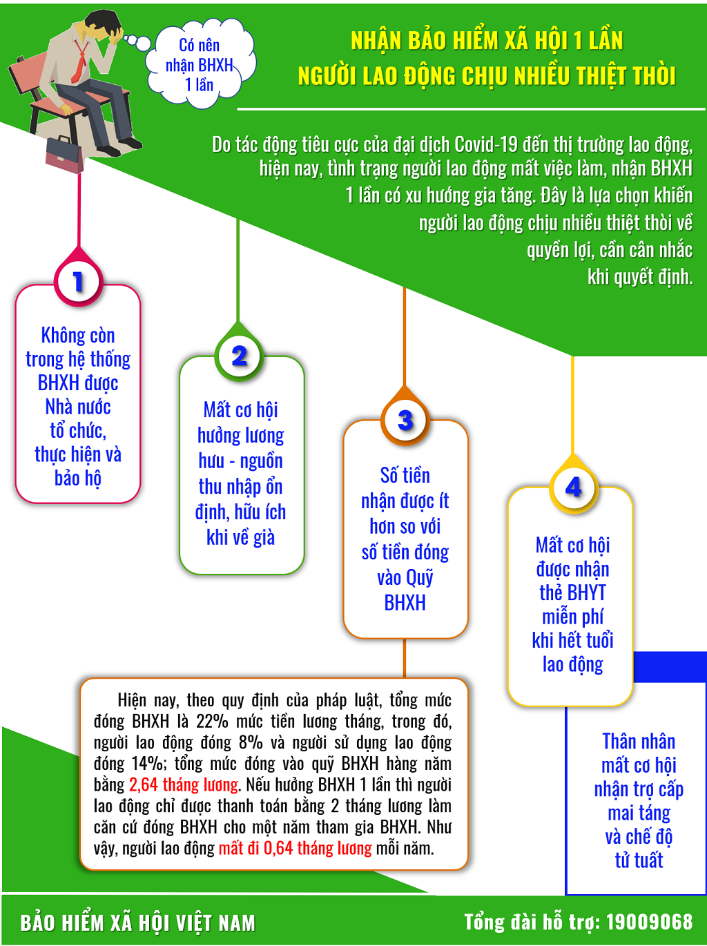 Tuy nhiên, hiện nay, dù đã có những chính sách hỗ trợ tích cực, cuộc sống của nhiều người dân, người lao động vẫn còn khó khăn. Bên cạnh đó, do nhu cầu trang trải cuộc sống trước mắt; do lôi kéo của một số đối tượng trục lợi chính sách; thêm tác động của việc sửa đổi chính sách nhưng công tác truyền thông, phổ biến chưa đầy đủ đến người dân, người lao động dẫn đến một bộ phận người lao động đã chuyển sang hưởng BHXH một lần. Đây là một hệ luỵ rất lớn cho người lao động, cho an sinh xã hội.
