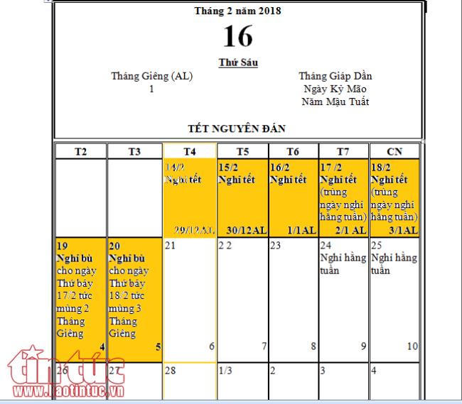 -Được nghỉ từ ngày 29 tháng Chạp năm Đinh Dậu đến Mùng 05 tháng Giêng năm Mậu Tuất (tức từ ngày 14/2 - 20/2/2018).