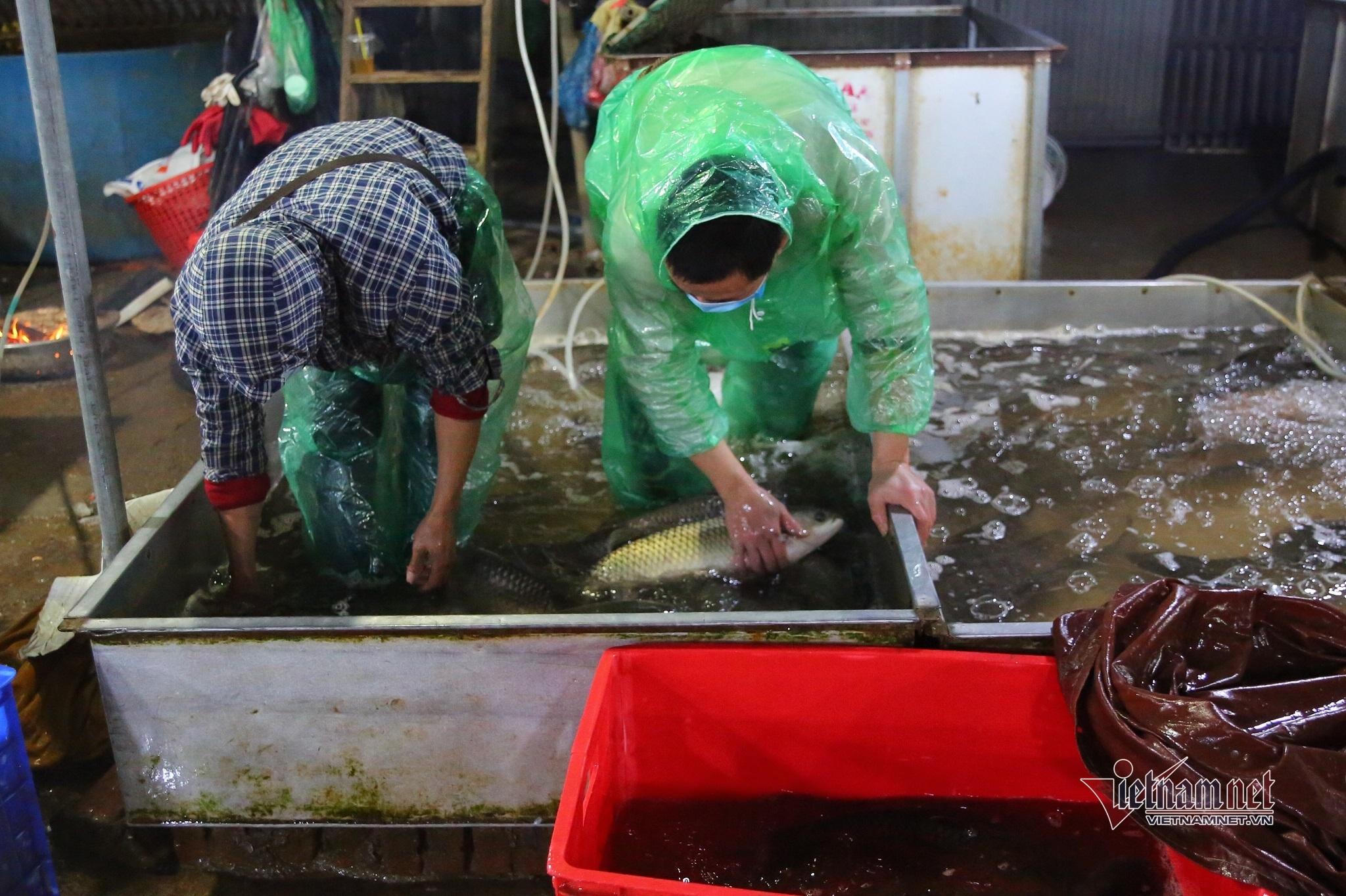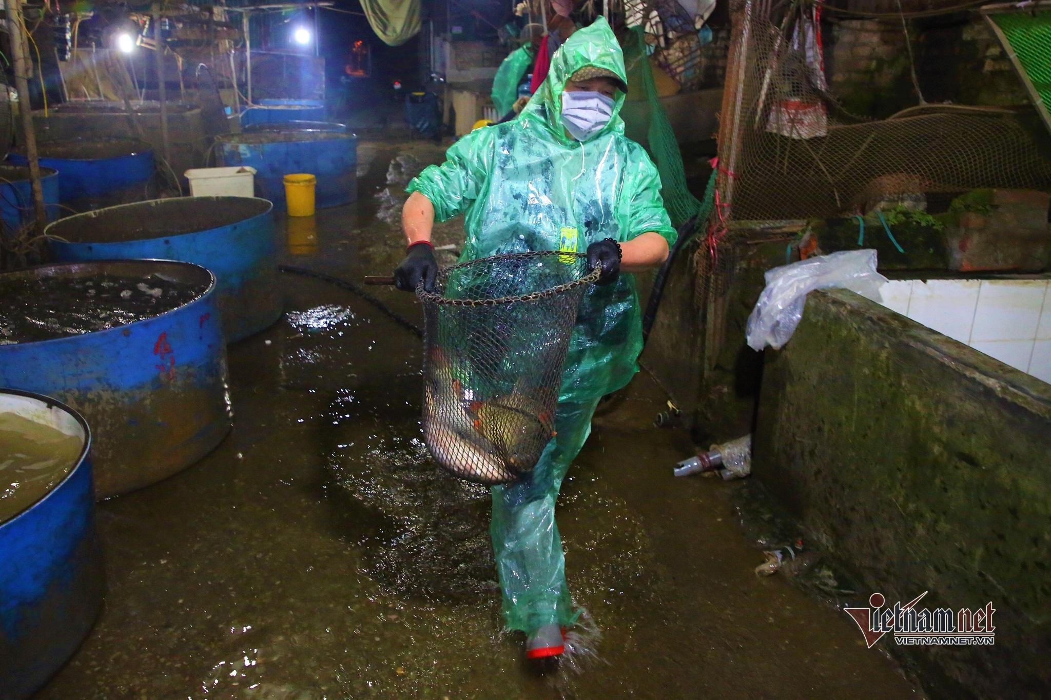 Chị Nguyễn Thị Hà (Văn Điển, Thanh Trì) bắt từng con cá trong chậu nước bỏ vào giỏ cho khách mang đi. Một đôi ủng, bộ quần áo mưa ni lông và vài ba lớp áo khoác là cách giữ ấm cơ thể tốt nhất mà chị Hà có thể làm được.