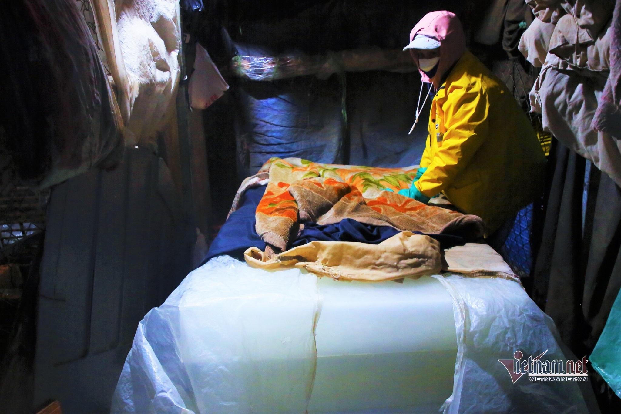 Do điều điện phải tiếp xúc trực tiếp với đá lạnh nên ngoài quần áo giữ nhiệt, áo khoác thì bà Tư đã mặc đến 2 áo mưa, đi 2 đôi găng tay.