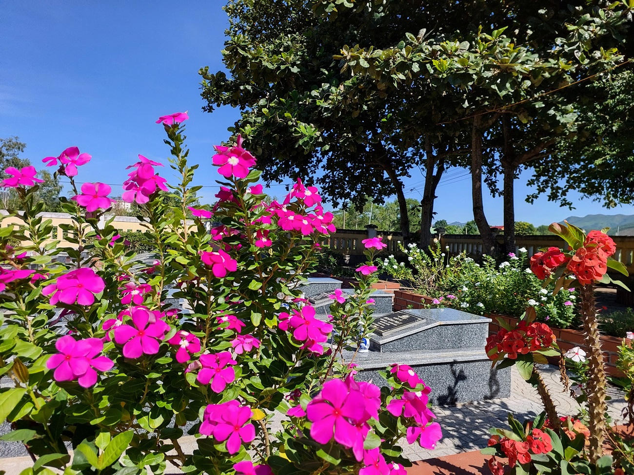 Vườn hoa, cây cảnh trong Nghĩa trang Liệt sĩ xã Tiến Hoá khoe sắc tưởng nhớ công lao to lớn của các Anh hùng liệt sĩ. |